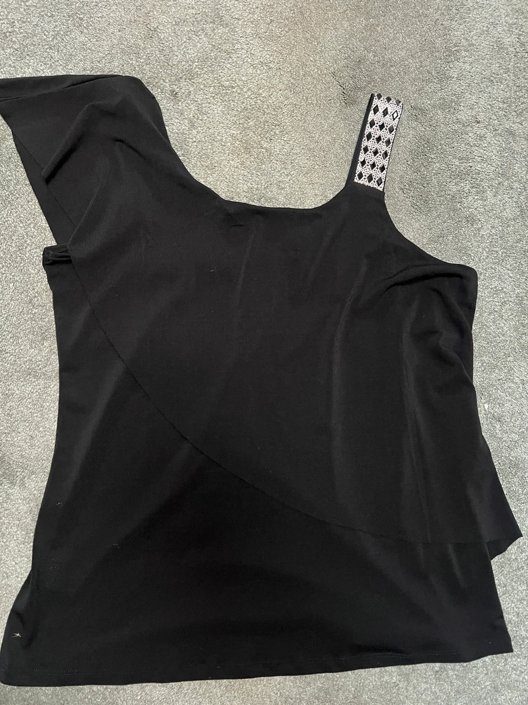 This is a stylish black one-shoulder top from Ross Dress for Less. It features an asymmetrical design and a decorative strap. Perfect for a night out or a special occasion!. Size L