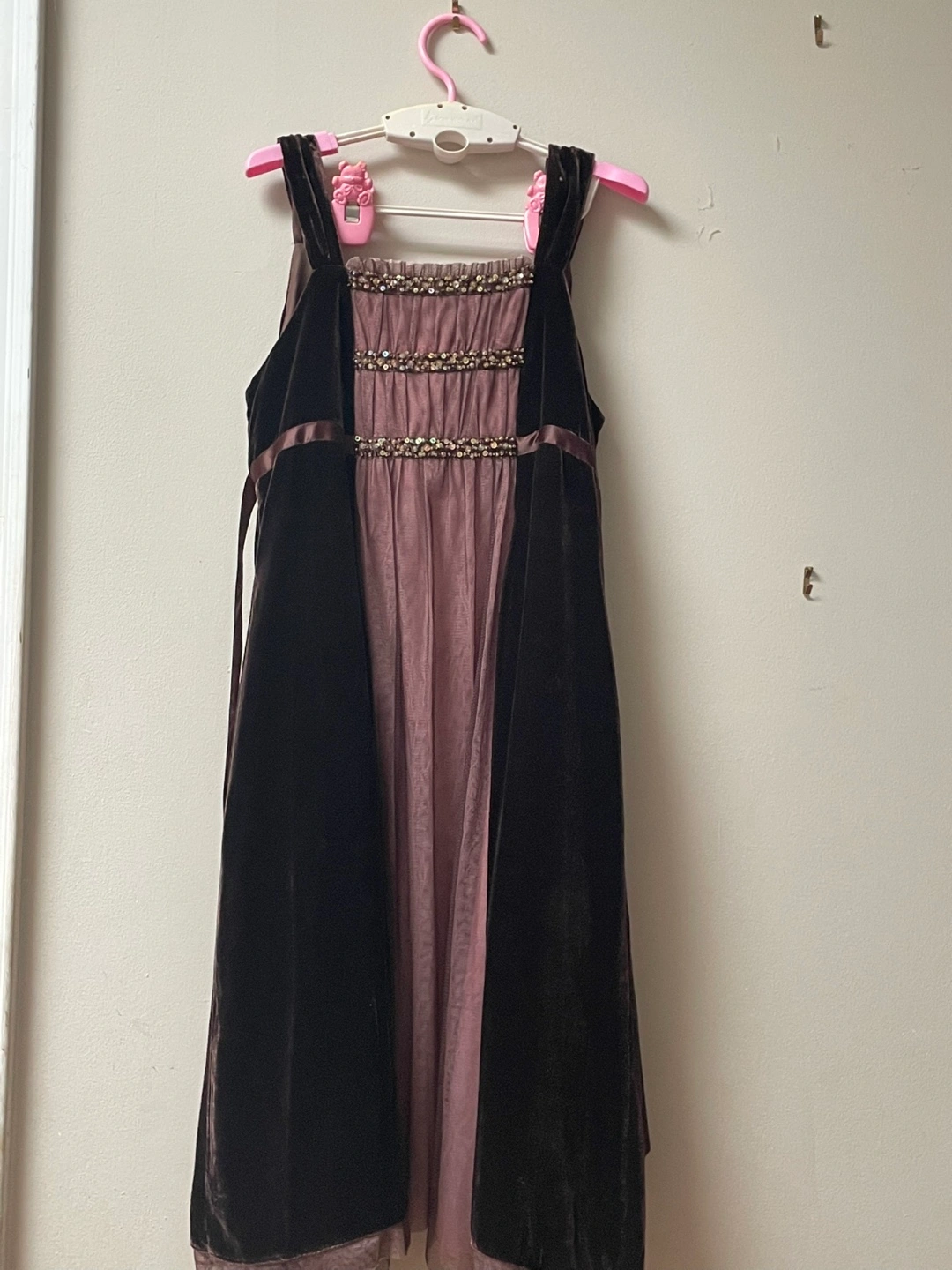 A lovely Biscotti dress in size 14! The dress features a beautiful brown and pink colour scheme with velvet accents. It's in great condition and would be perfect for a special occasion or event