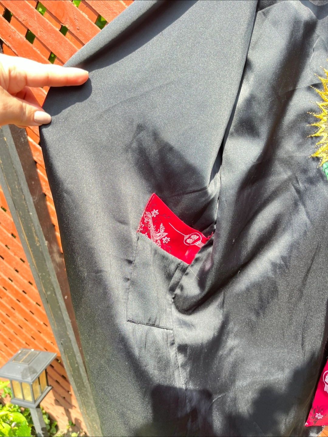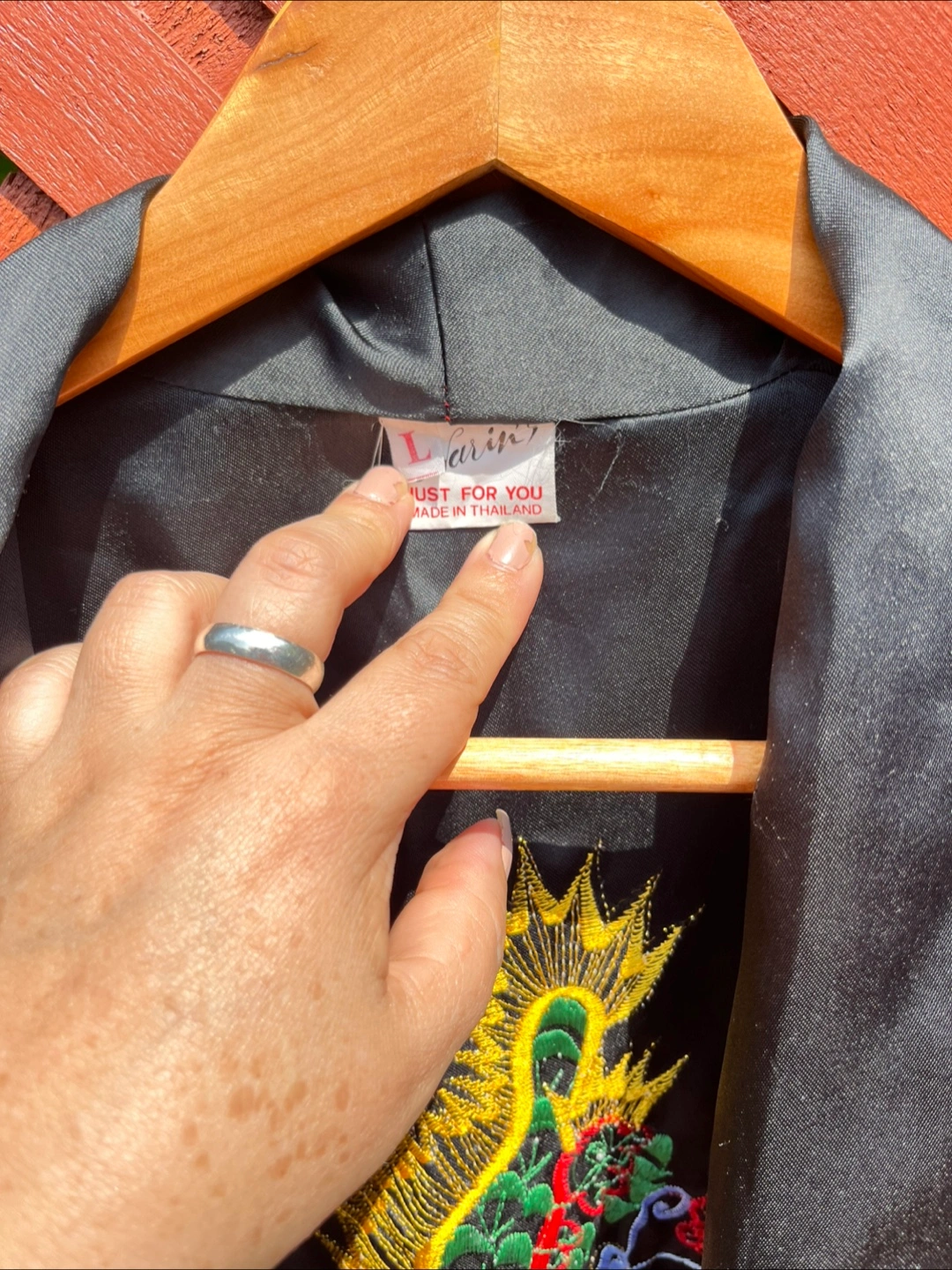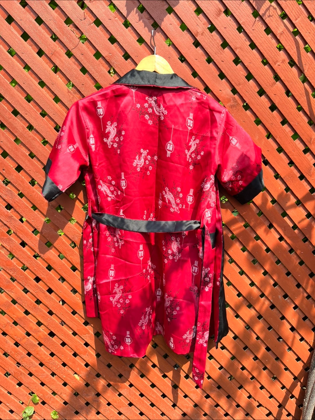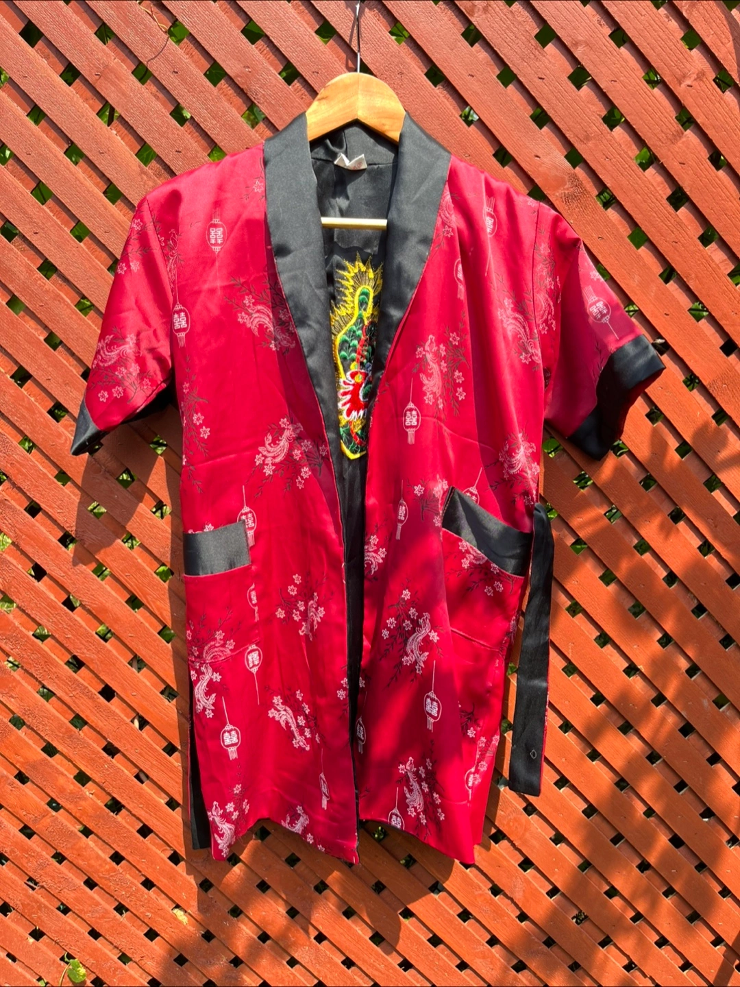 Selling a vibrant red robe with a dragon design. It features black accents and a tie belt. The robe is made in Thailand and has a unique design, perfect for adding a touch of flair to your wardrobe