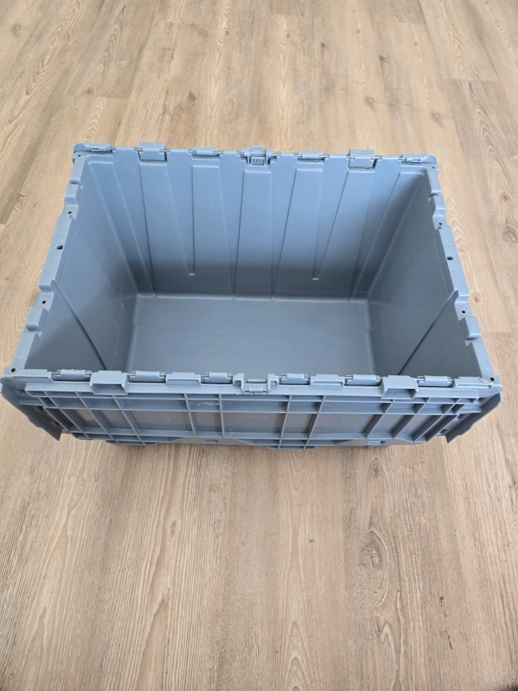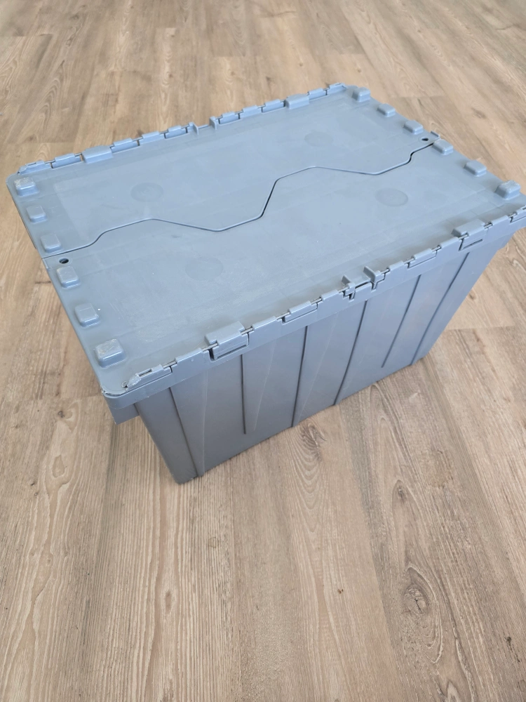 Selling a grey plastic storage tote. It's in great shape and ready to help you organize your space! Perfect for storing items in your home, garage, or office. The tote is durable and has a secure lid to keep your belongings safe and sound