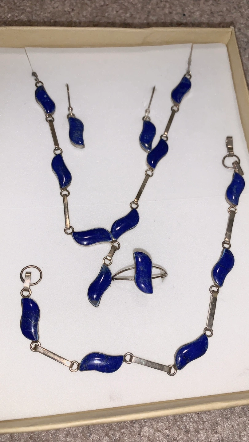 Selling a beautiful lapis lazuli jewellery set! It includes a necklace, bracelet, earrings, and a ring (size 7-8). Comes in a box, perfect for gifting or keeping it safe!