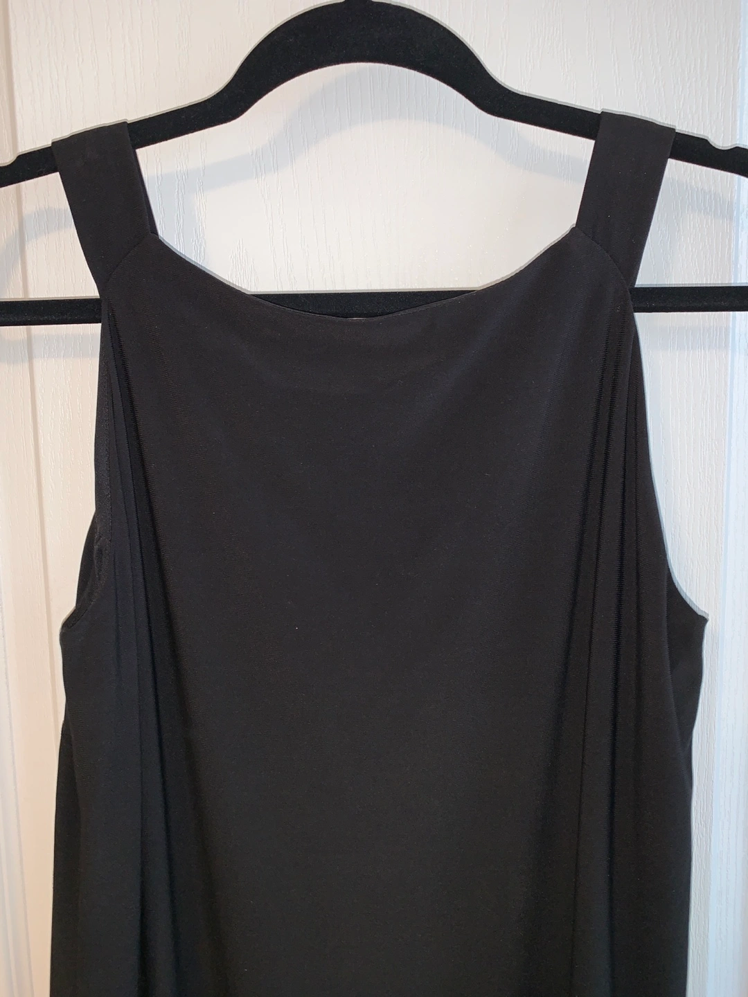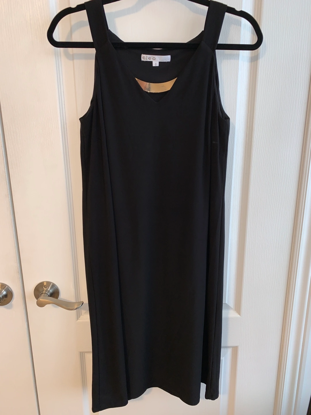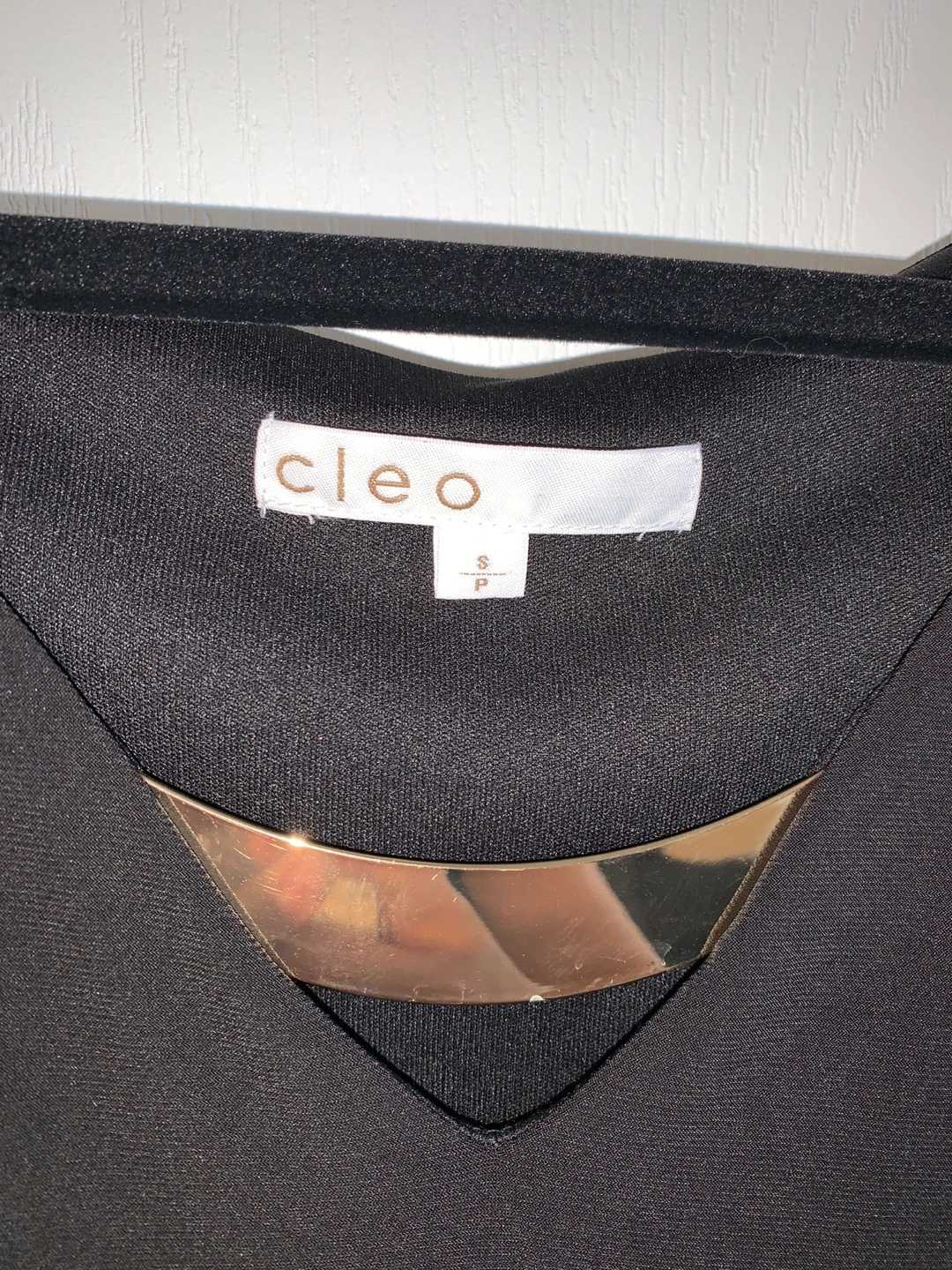 Selling a lovely black dress from Cleo in size small! It's in great condition and features a stylish V-neck design with a metallic accent. Perfect for a night out or a special occasion!