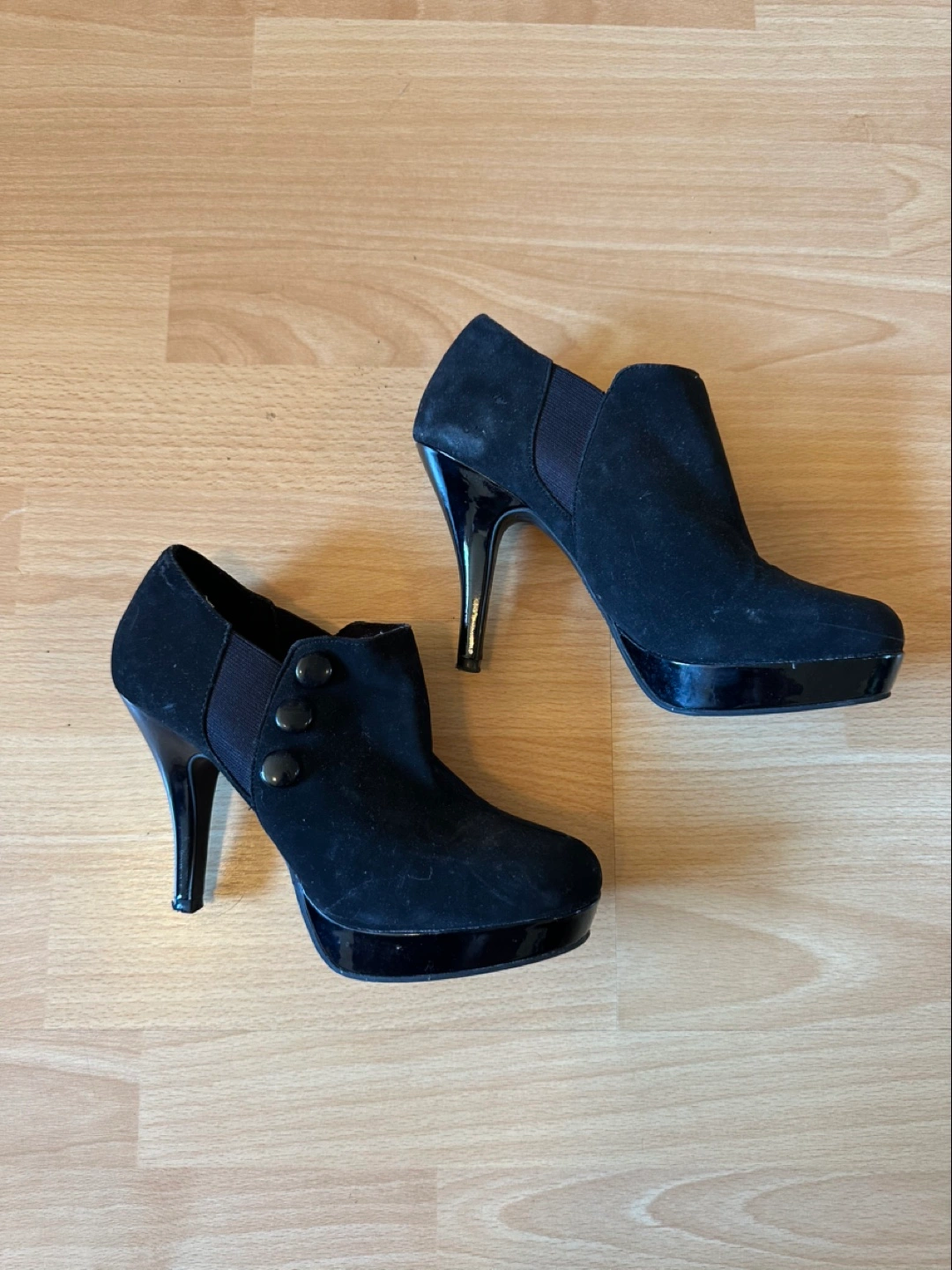 Features a 3.5” heel with 0.5” platform. Black micro-suede fabric with shiny pleather trim.