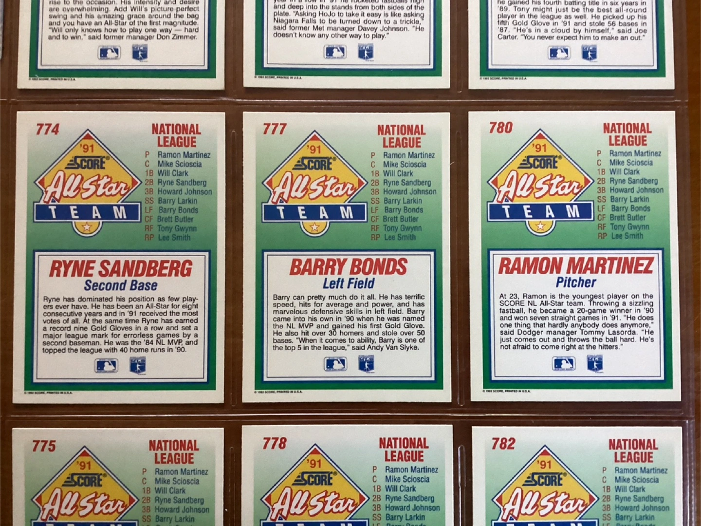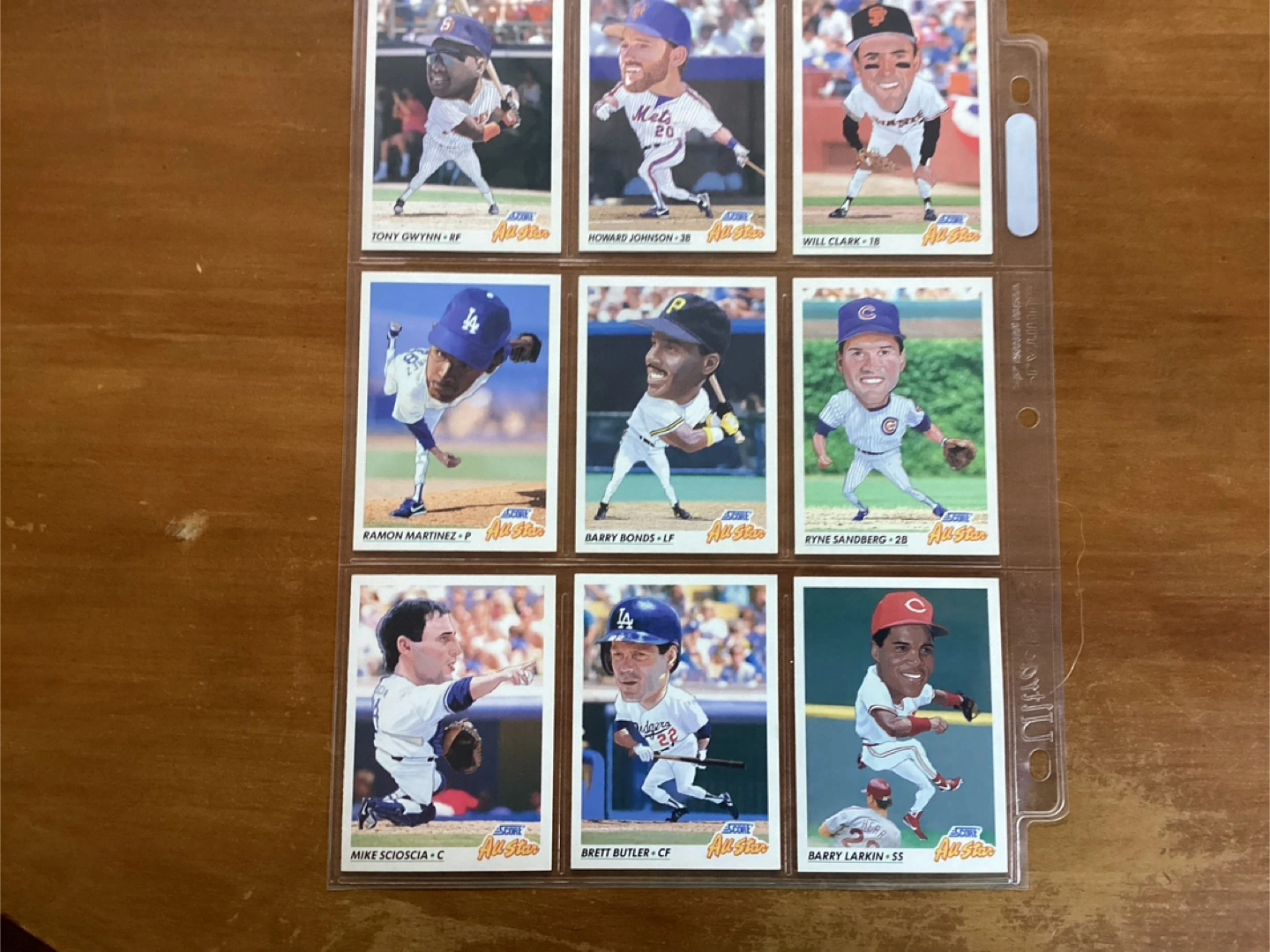 $15.00 for all 9 cards - WILL CLARK, RYNE SANDBERG, BARRY LARKIN, HOWARD JOHNSON, BARRY BONDS, BRETT BUTLER, TONY GWYNN, RAMON MARTINEZ & MiIKE SCIOSCIA - All in MINT condition - Shipping available - Located at Pape ave & Cosburn ave Toronto - Call Patrick @ 416-930-8338. - Thanks & check out my other posts