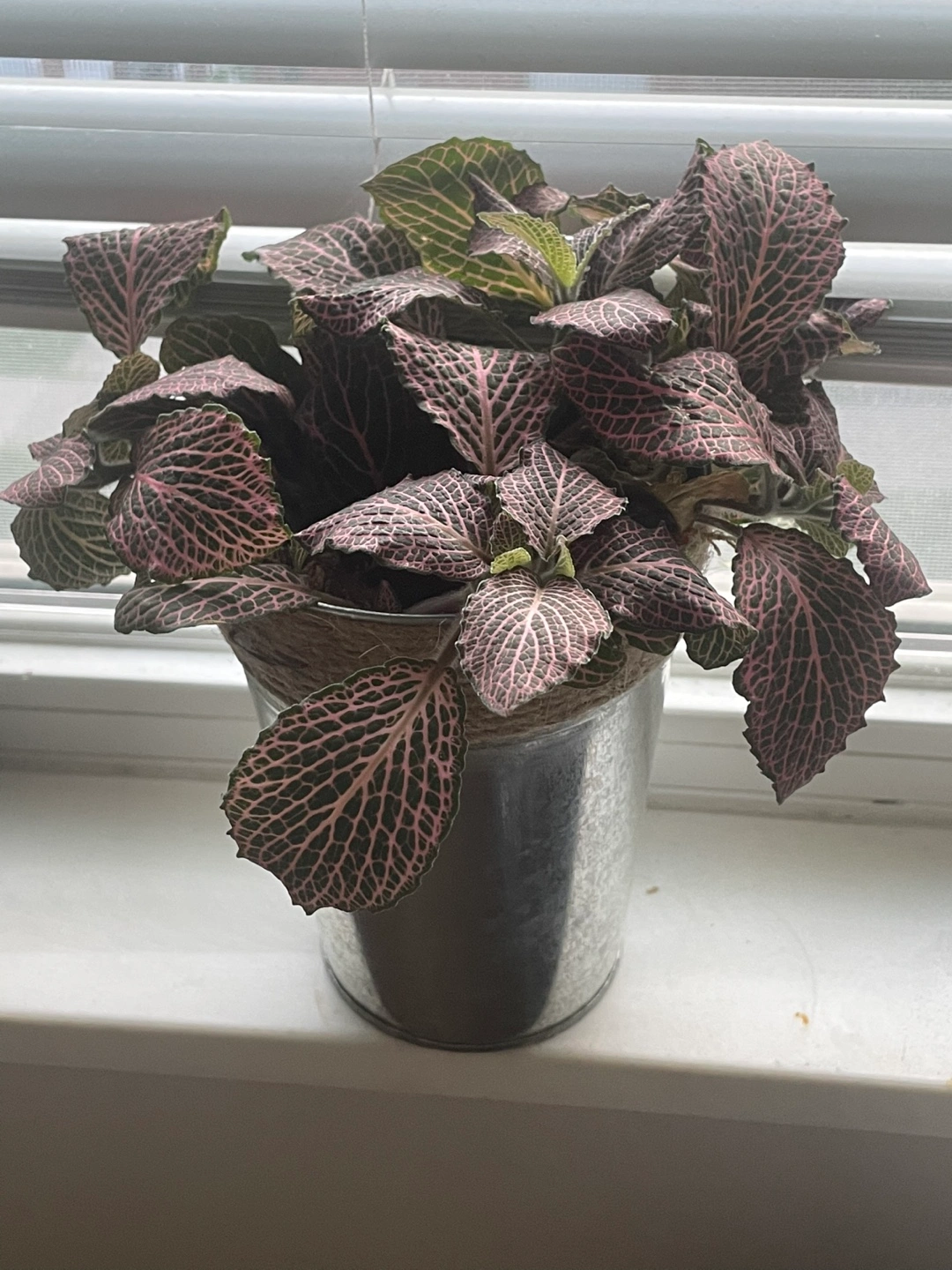 A beautiful nerve plant in a silver pot, perfect for adding a touch of greenery to your home! The plant has striking pink veins and is in great condition. It's a low-maintenance plant that thrives in indirect light.