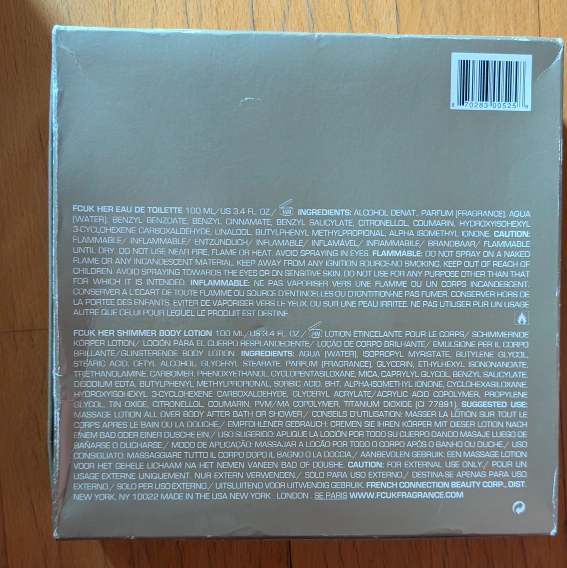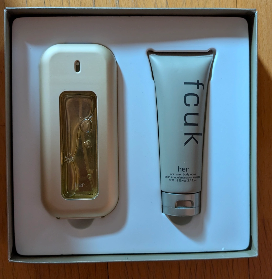 Selling a FCUK Her Eau de Toilette 100 ml and Shimmer Body Lotion 100 ml set. The set includes both the perfume and the body lotion in their original packaging. Perfect as a gift or for yourself!