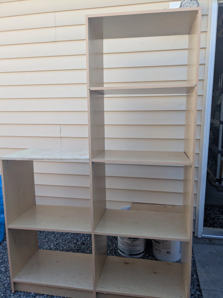 Selling a wooden shelf unit. It has some wear and tear but is still very useful. Perfect for storage in a garage, basement, or even a kids' room