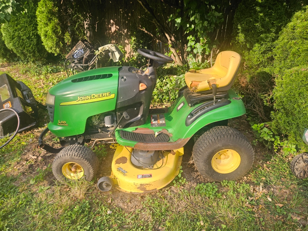 John Deere L110 Automatic 42 in. deck tractor W/catcher. 17 Horsepower Kohler motor. New deck belt, new rear tires turff savers.648 hours on digital dash. Needs battery and spark plug. $300 non negotiable.