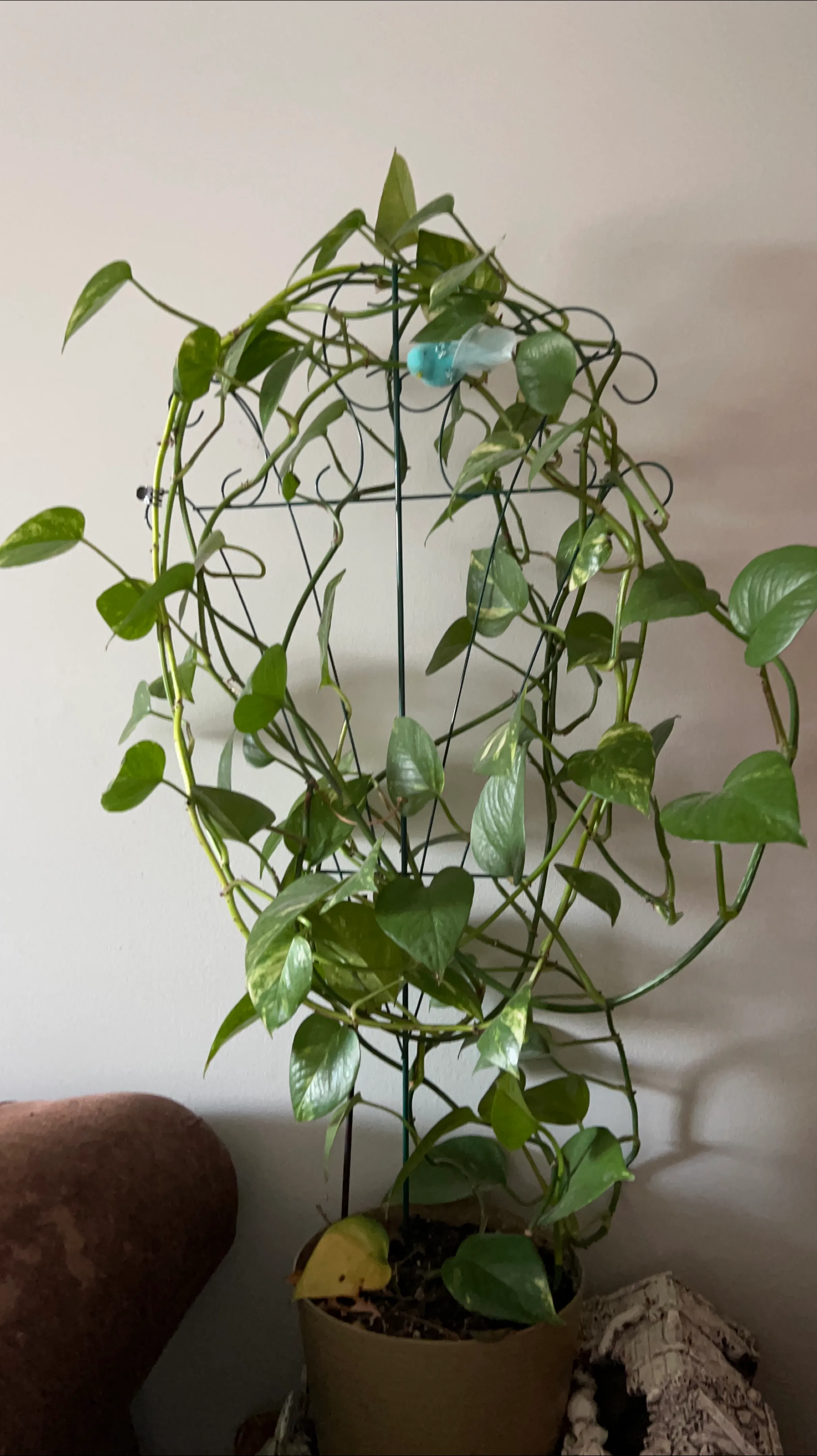 Selling a lovely golden pothos plant! It comes with a support structure and is potted in a neutral-toned pot. This plant is easy to care for and will add a touch of greenery to your home.