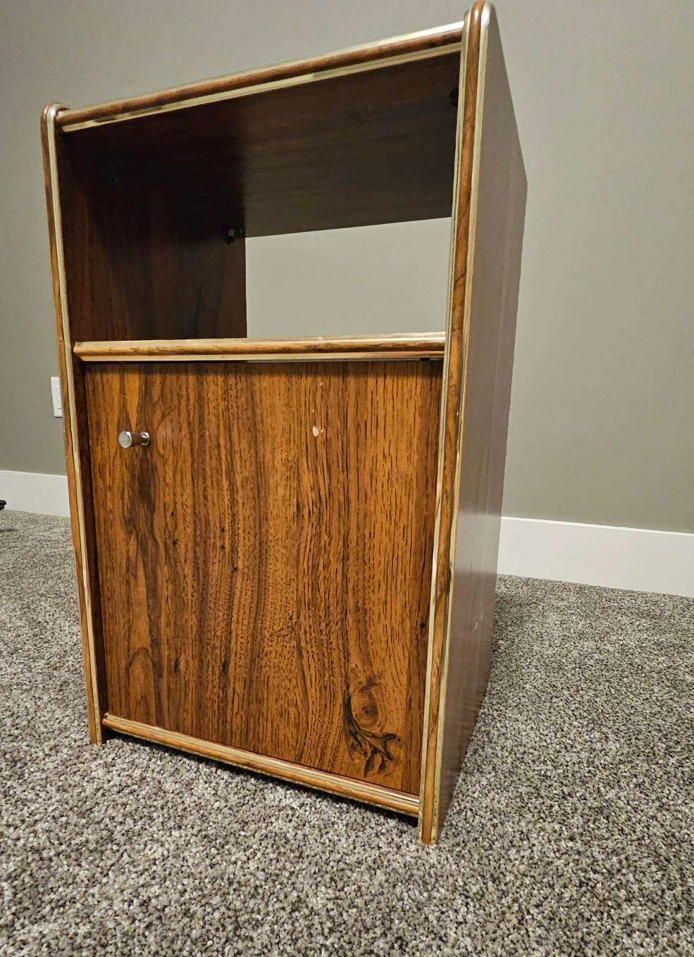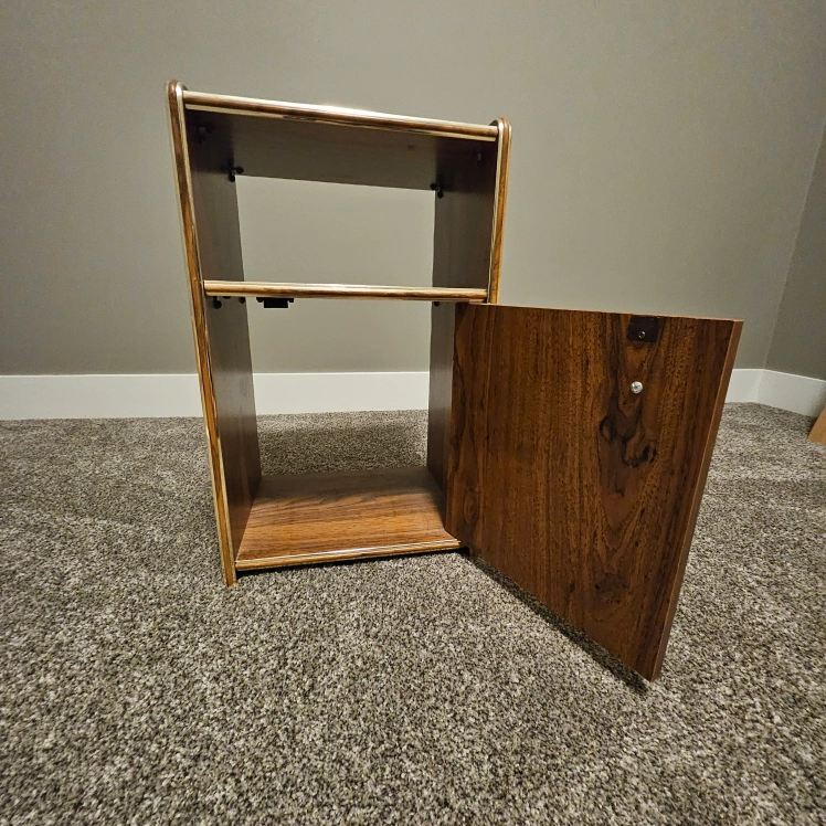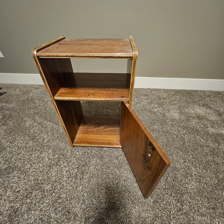 Selling a cute wooden side table! It has a shelf on top and a cabinet with a door below for extra storage. Great for a bedside table or small storage unit in any room.