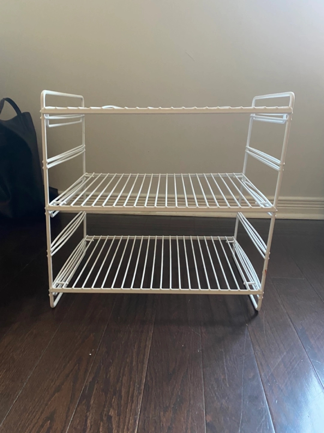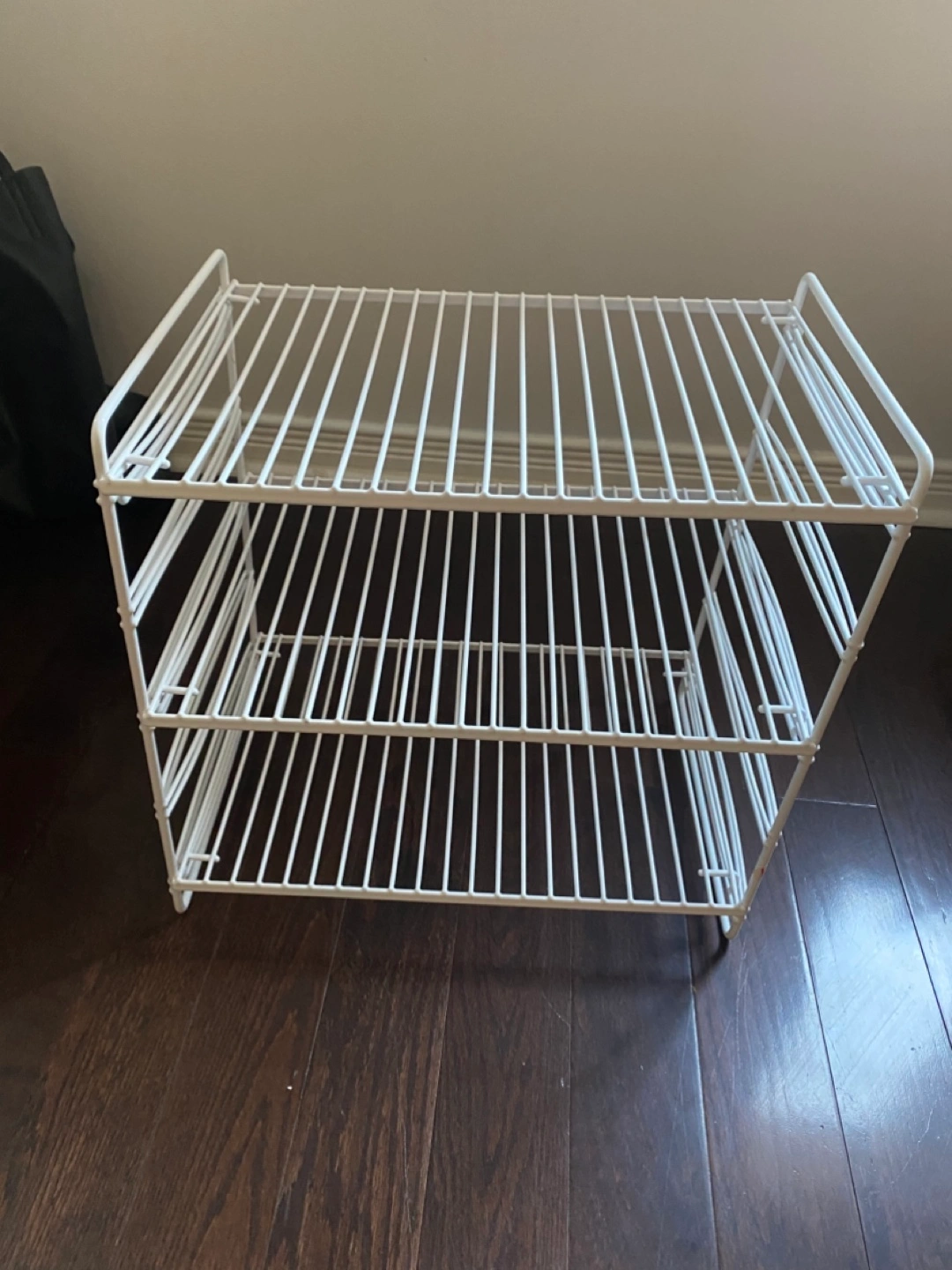 Here's a handy white wire shelf with three tiers! Perfect for organizing shoes, pantry items, or anything else you need to store. It's brand new!