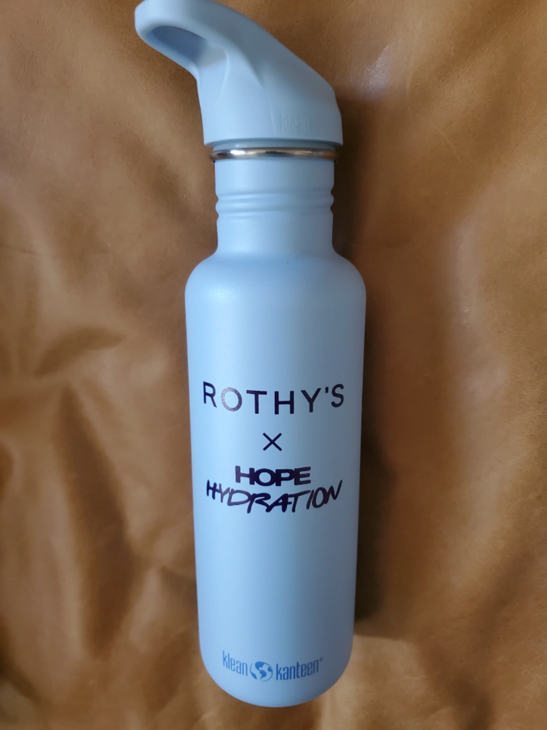I'm selling a Rothys x Klean Kanteen Hope Hydration water bottle! Brand New, 27 oz bottle features a light blue color and has the Rothys and Klean Kanteen logos, along with 'Hope Hydration' and 'Plastic Pause' designs. Perfect for staying hydrated on the go!