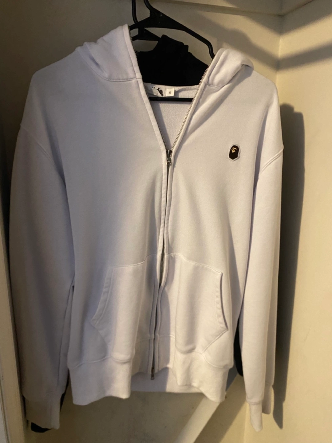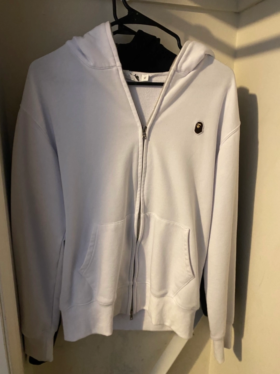 Selling a BAPE full zip hoodie in white, size XL asian size. It's in great condition and ready for a new home! The hoodie features the iconic BAPE logo on the chest. Perfect for adding a touch of streetwear style to your wardrobe
