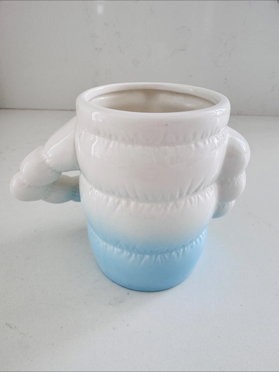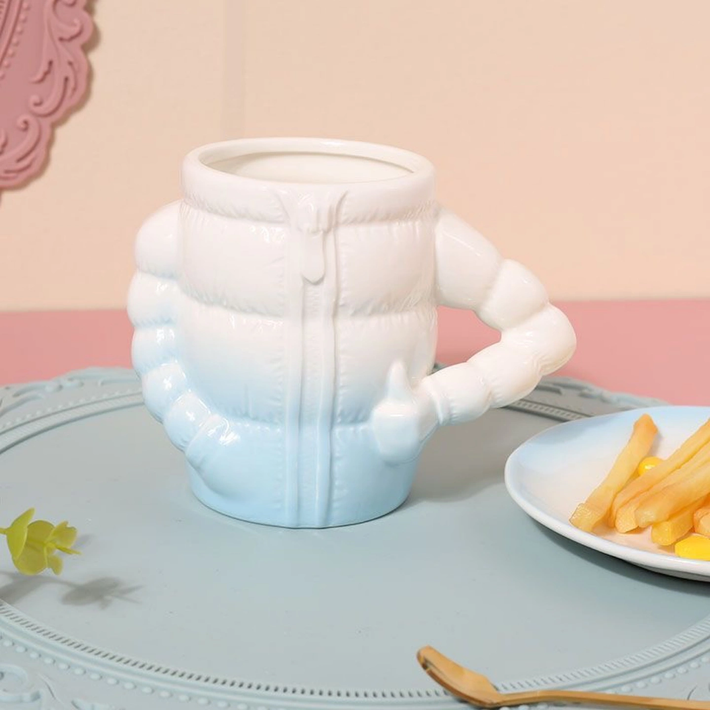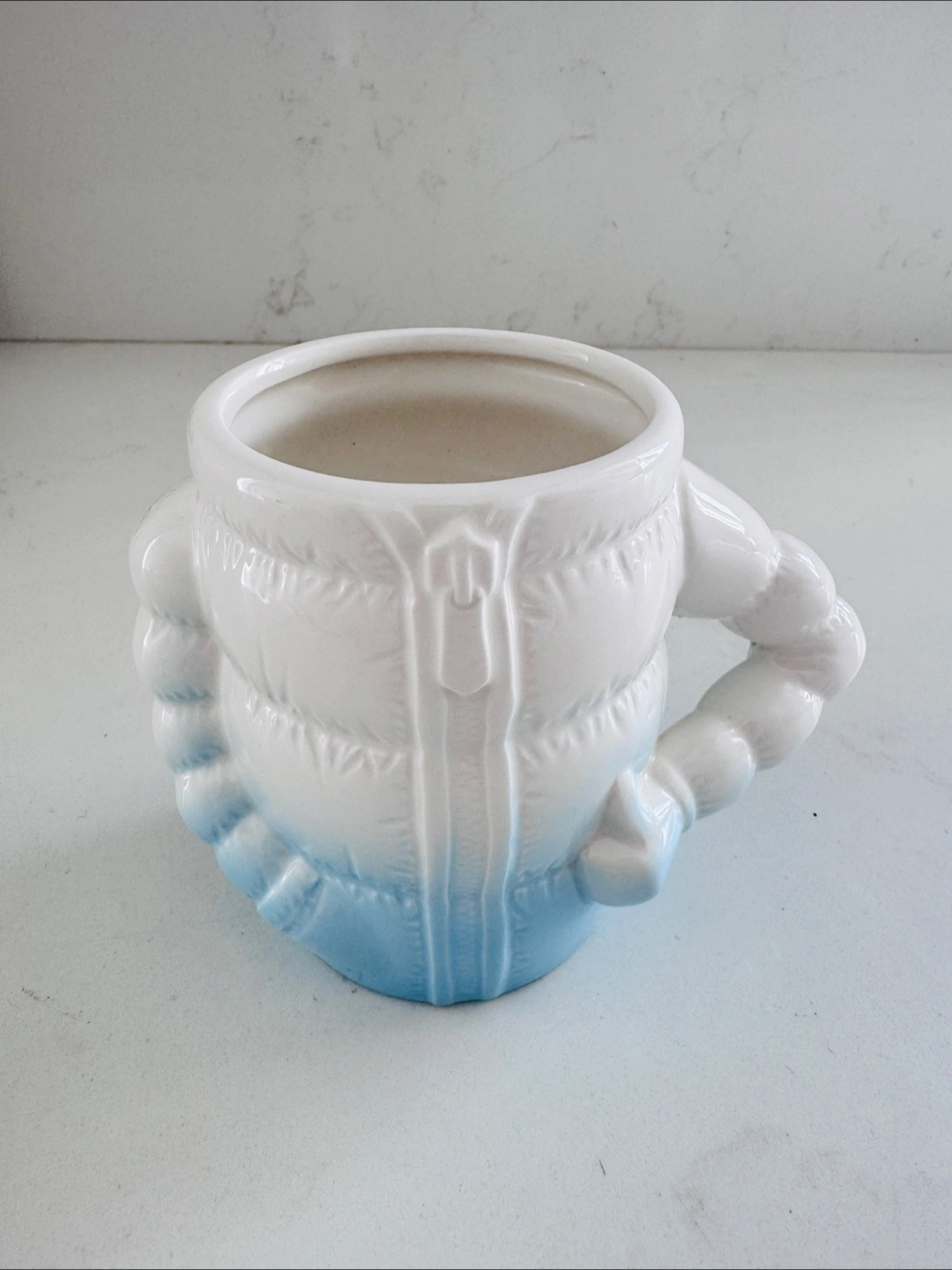 How cute is this mug? It's shaped like a little puffer jacket! The top is white and it fades into a nice light blue at the bottom. Perfect for cozying up with a warm drink!