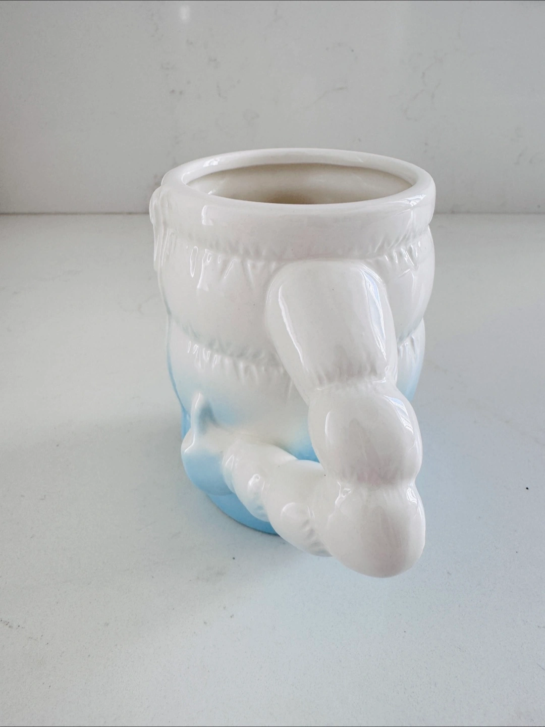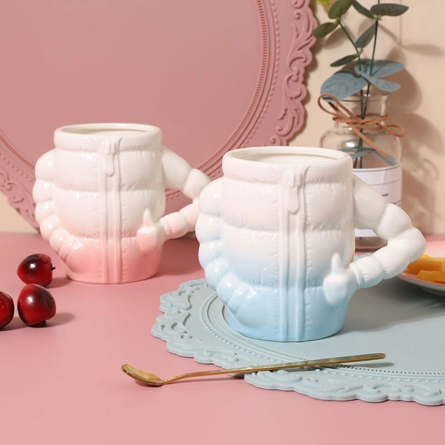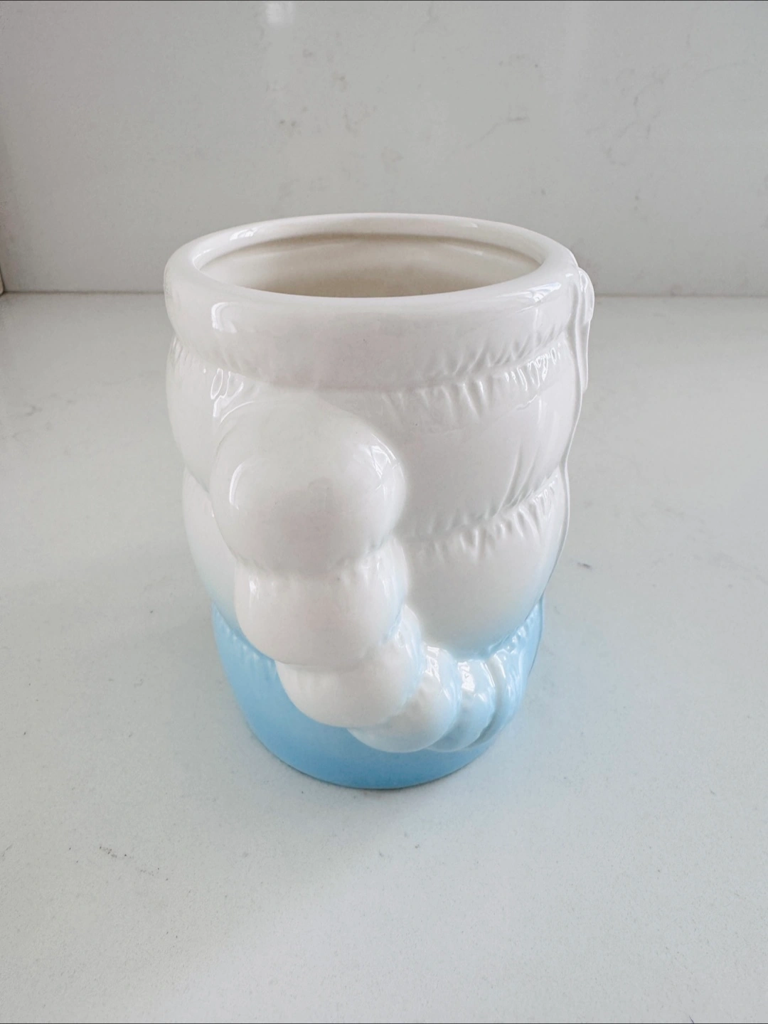 How cute is this mug? It's shaped like a little puffer jacket! The top is white and it fades into a nice light blue at the bottom. Perfect for cozying up with a warm drink!