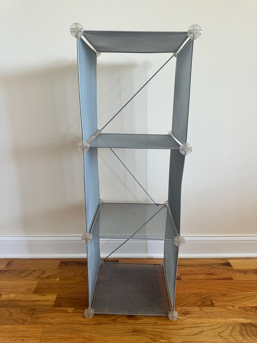 Selling a gray mesh 3-tier shelf! It's perfect for adding some extra storage space to any room. It has some minor imperfections but sturdy.
