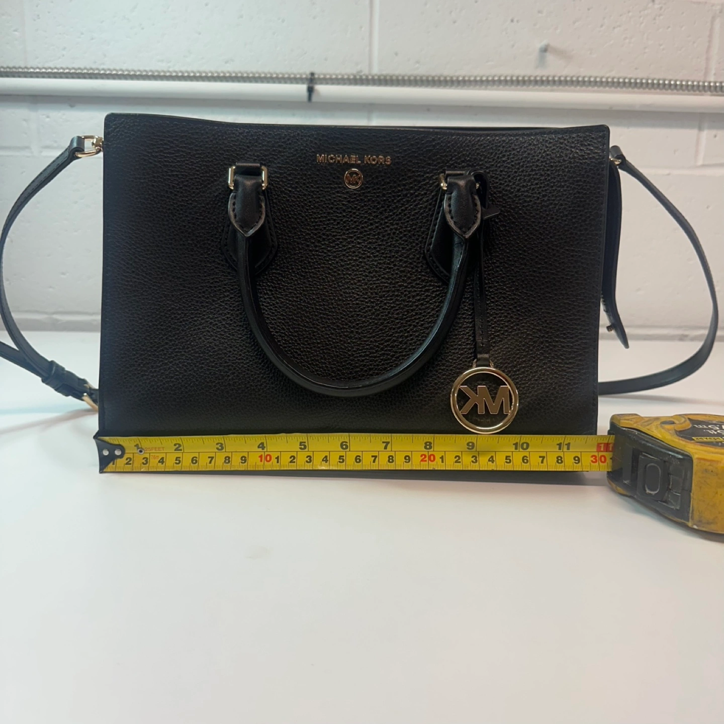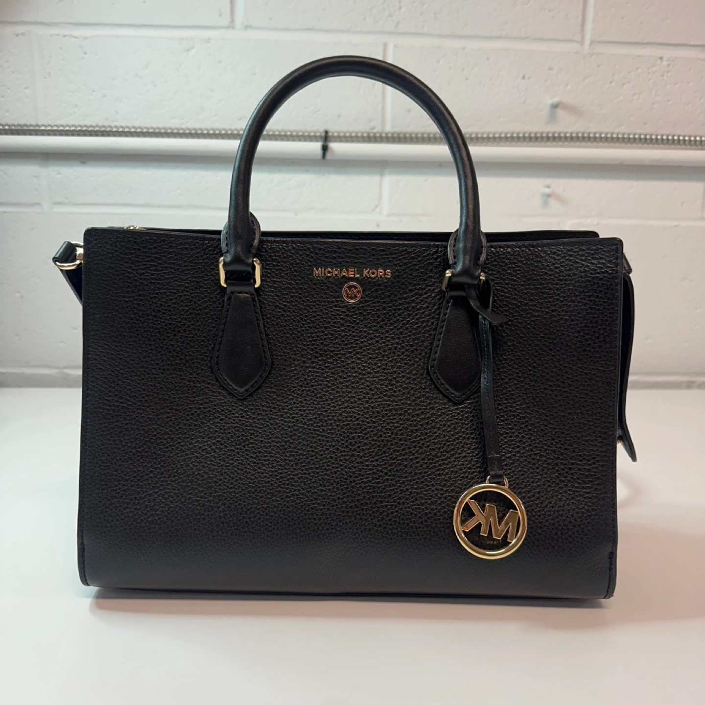 Selling a gently used Michael Kors black leather tote bag. It's in great condition and perfect for everyday use! The bag features a classic design with gold-tone hardware and multiple interior compartments to keep your belongings organized. The material is leather.