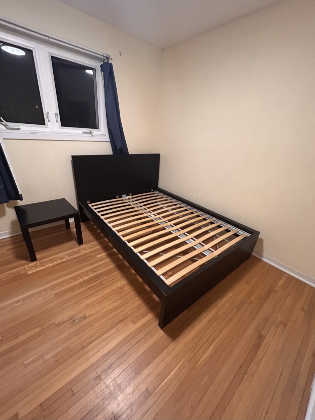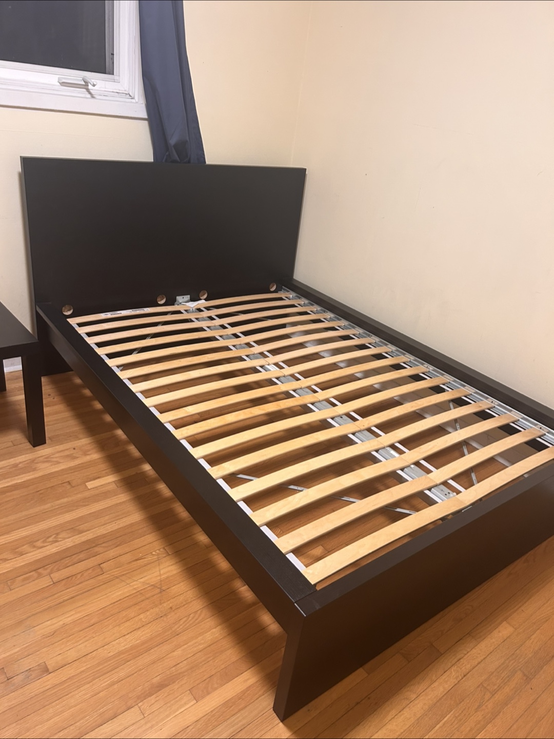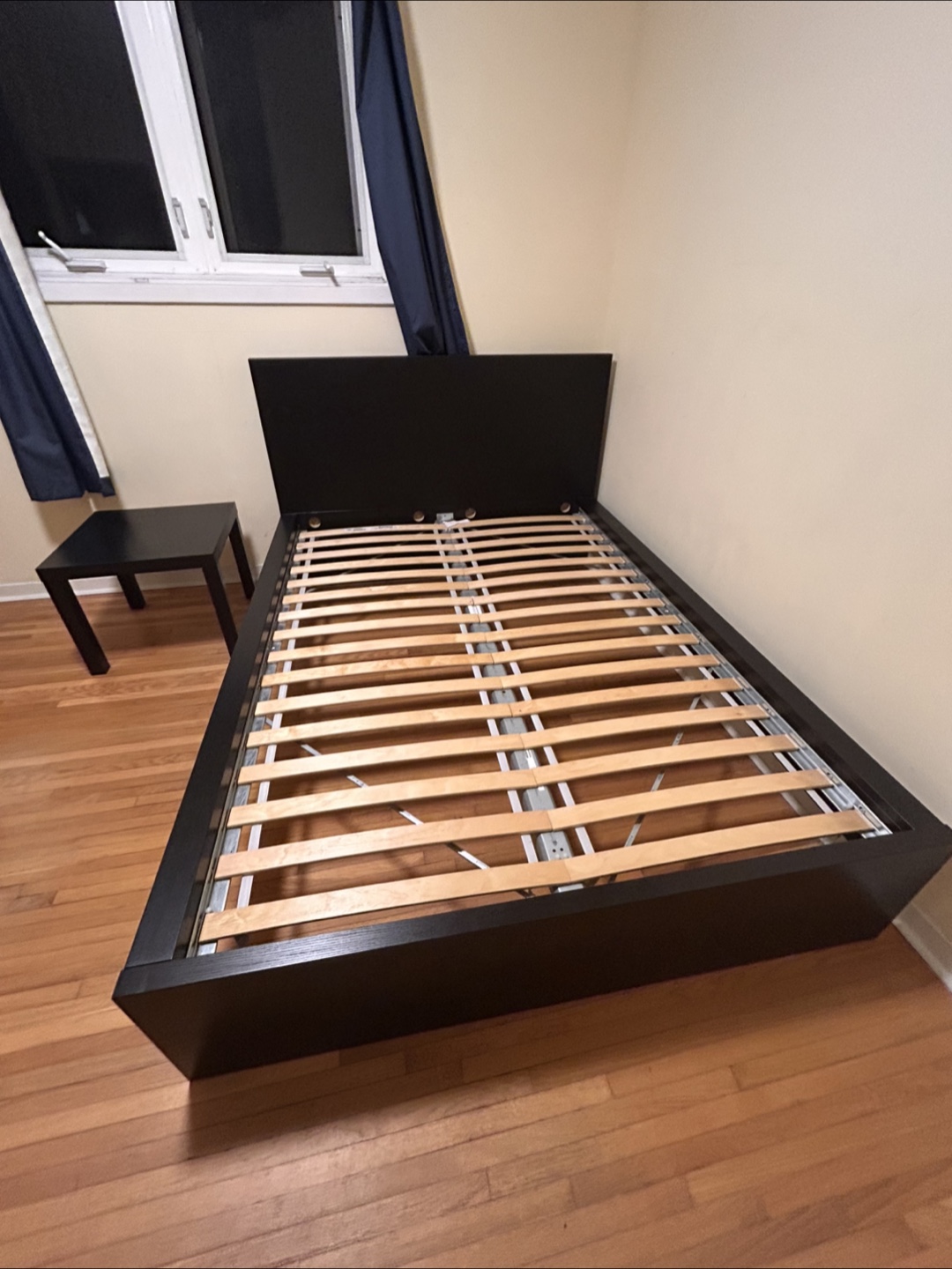 Selling an IKEA Malm bed frame in dark brown. It's in good condition and ready for a new home. Sturdy and stylish, it's a great addition to any bedroom. Had it for a year and now am looking for a new one so its in amazing condition, no chipping at all, some small scratches maybe. Its half disassembled for easy pick up and moving. I have all the parts for assembly. Perfect for a minimalist look!
