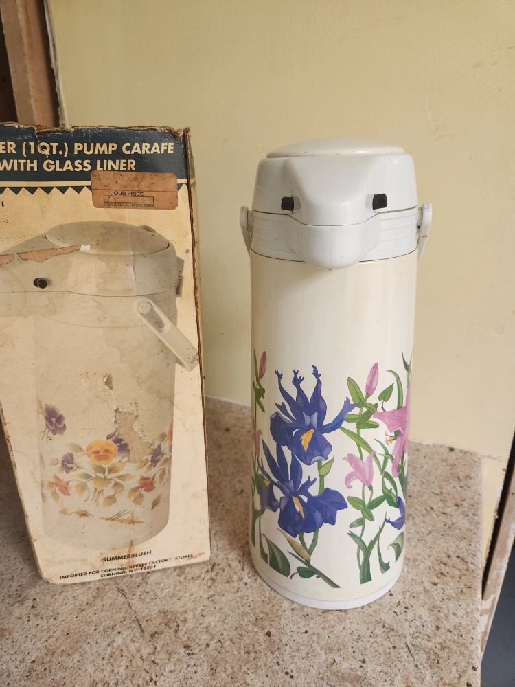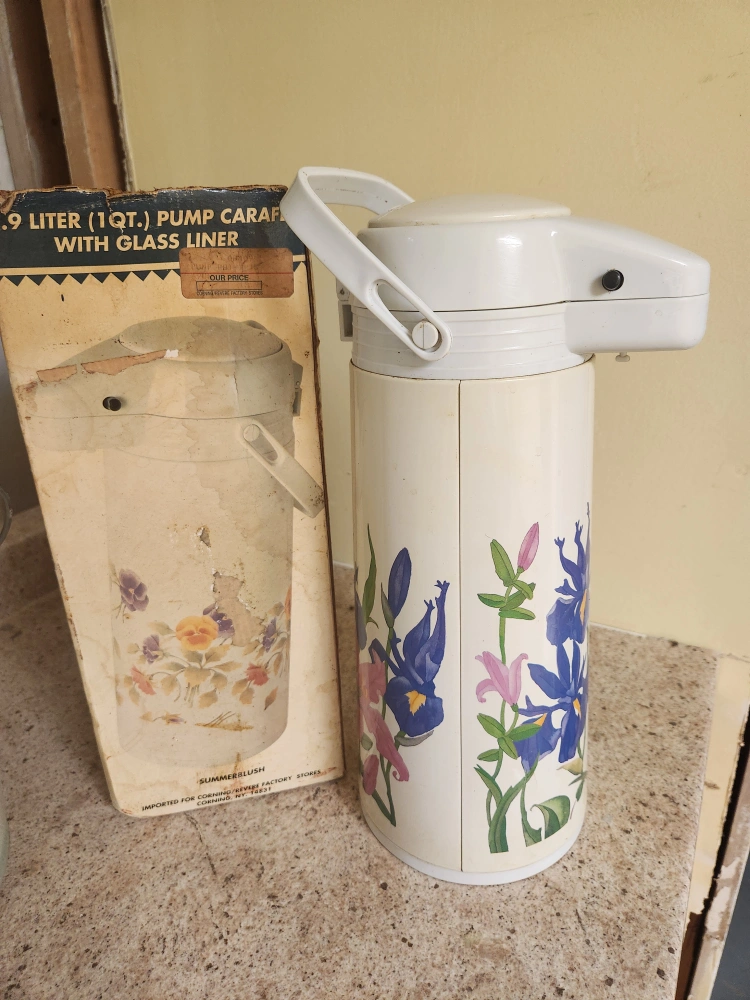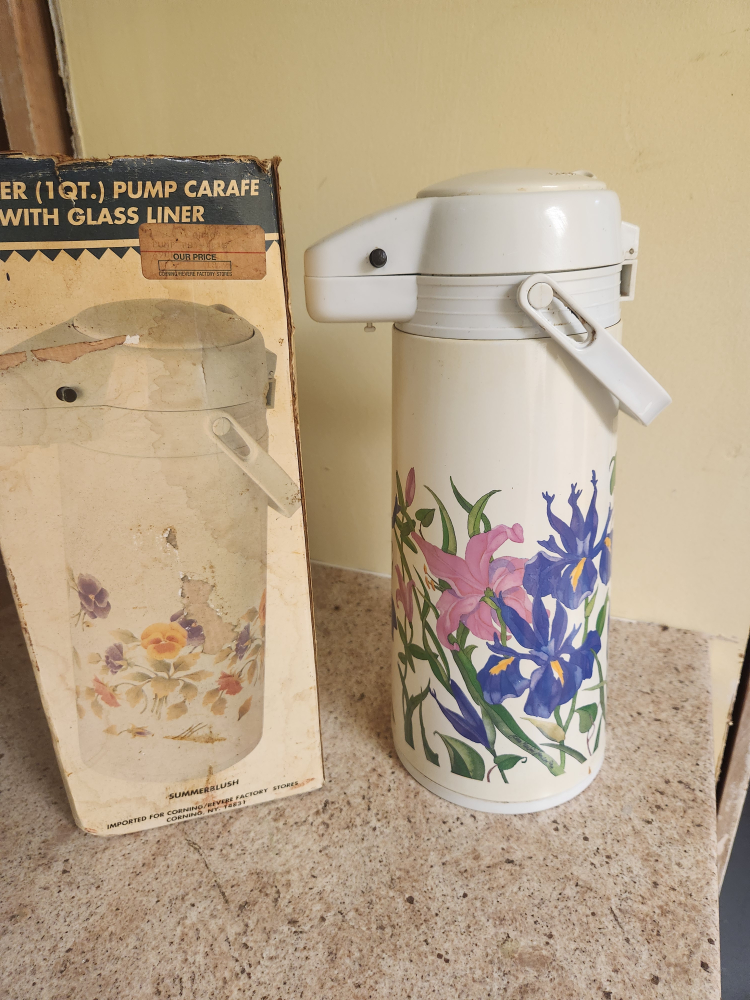 Selling a Summerblush 1 Quart Pump Carafe with a glass liner. It features a floral design and comes with the original box