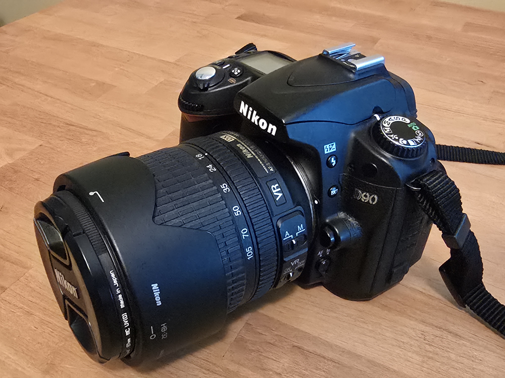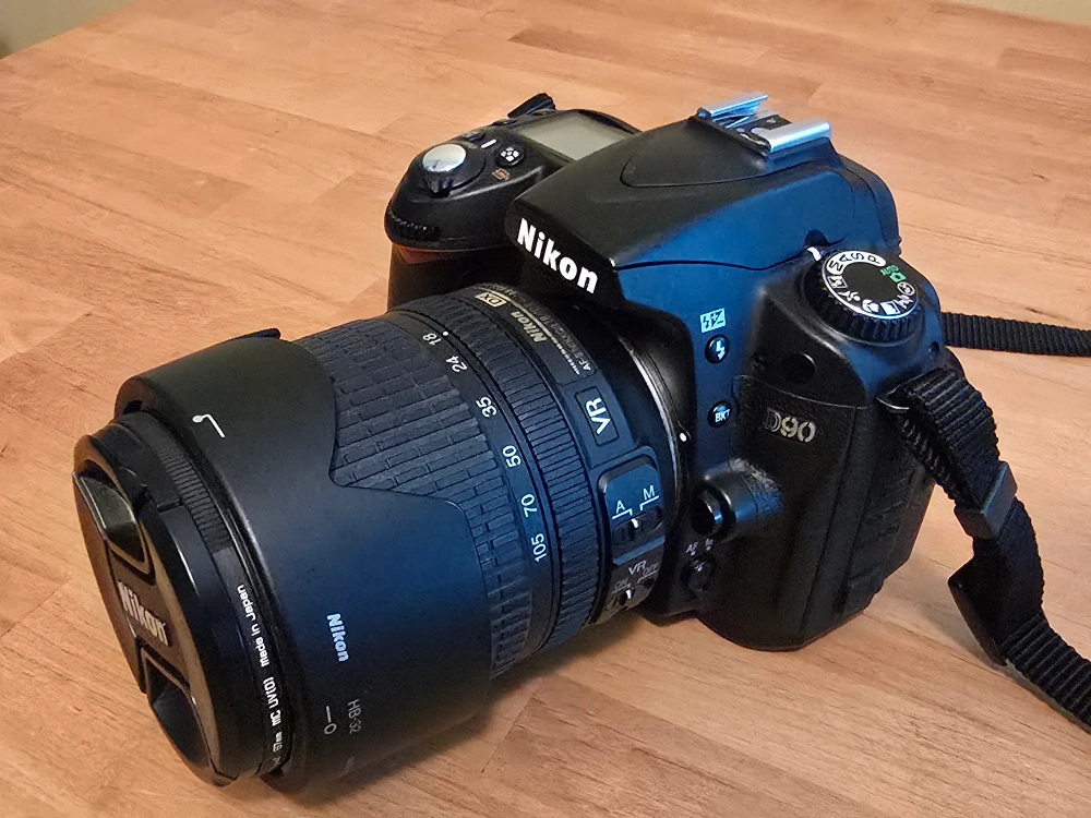 Selling a Nikon D90 DSLR camera in good condition. It comes with a Nikon lens, a remote control (MC-DC2), and two SanDisk 4Gb memory cards. Perfect for photography enthusiasts.