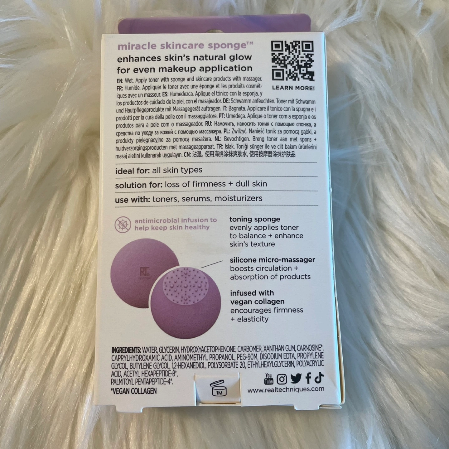 I'm selling a brand new Real Techniques Miracle Skincare Sponge! This sponge enhances skin's natural glow for even makeup application. It's ideal for all skin types and helps with loss of firmness and dull skin. It's designed for use with toners, serums, and moisturizers. The sponge features a silicone micro-massager to boost circulation and absorption of products, and it's infused with vegan collagen to encourage firmness and elasticity
