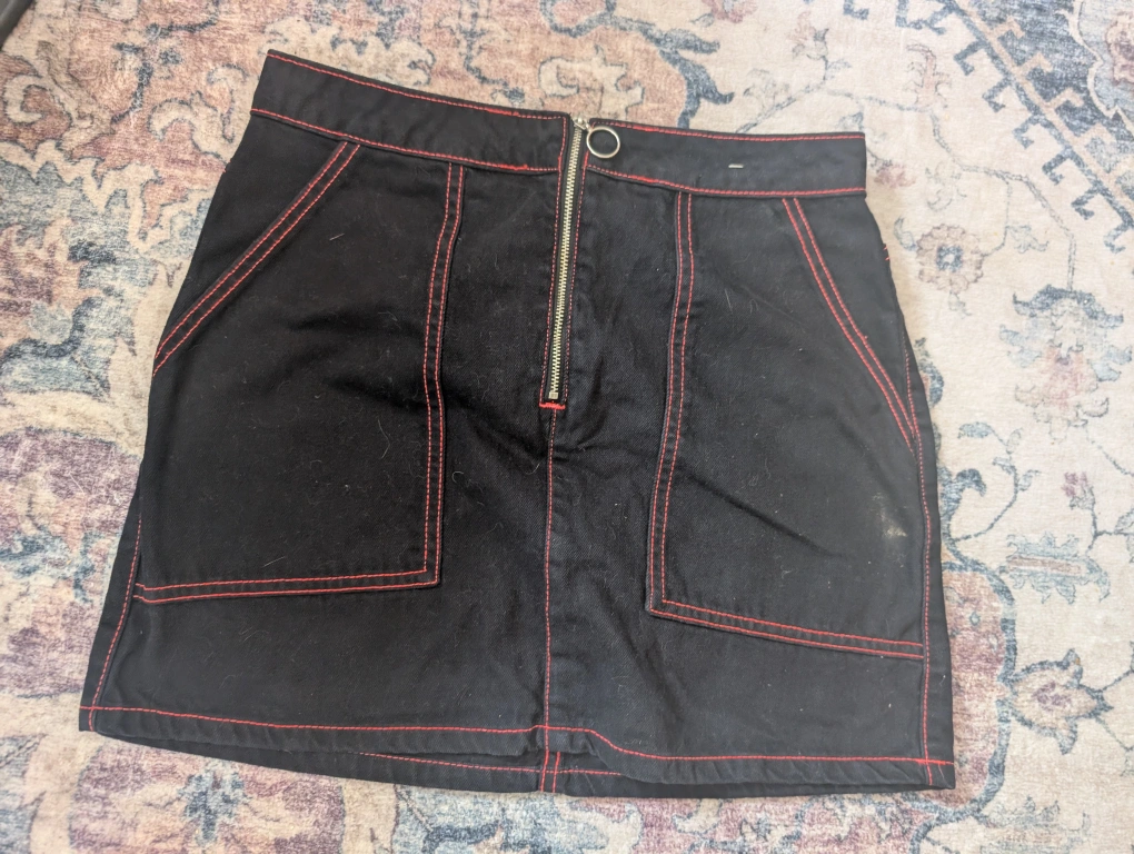 Here's a cute black mini skirt with red stitching! It features a silver zipper and pocket details. It's in good condition and ready for a new home!