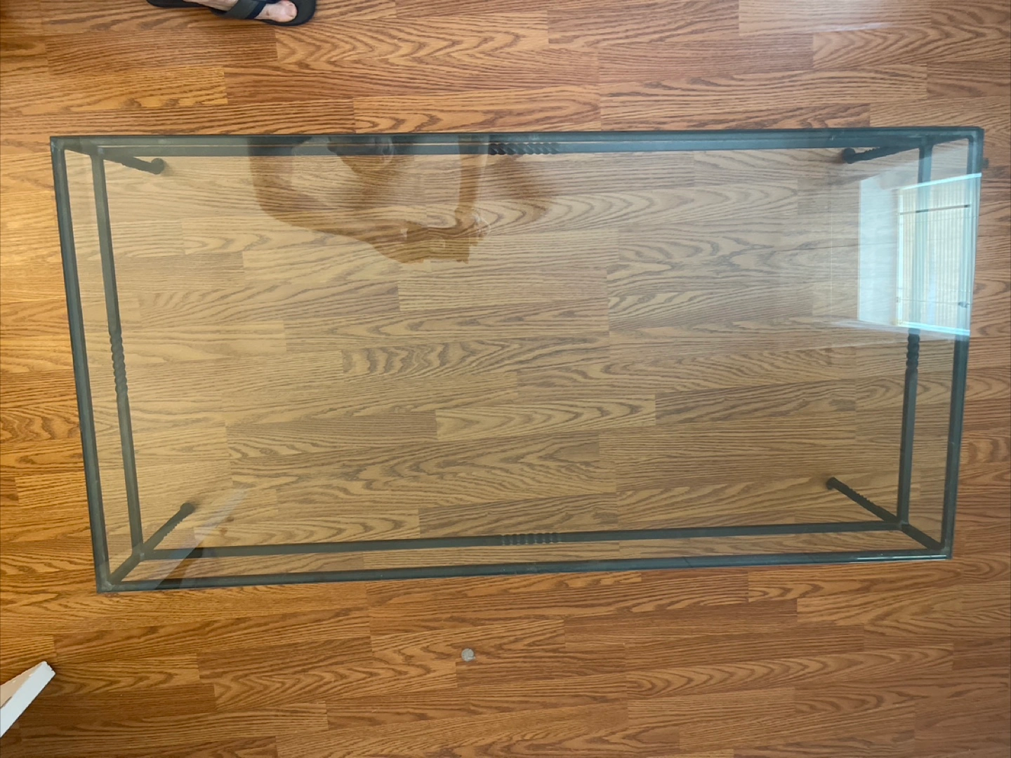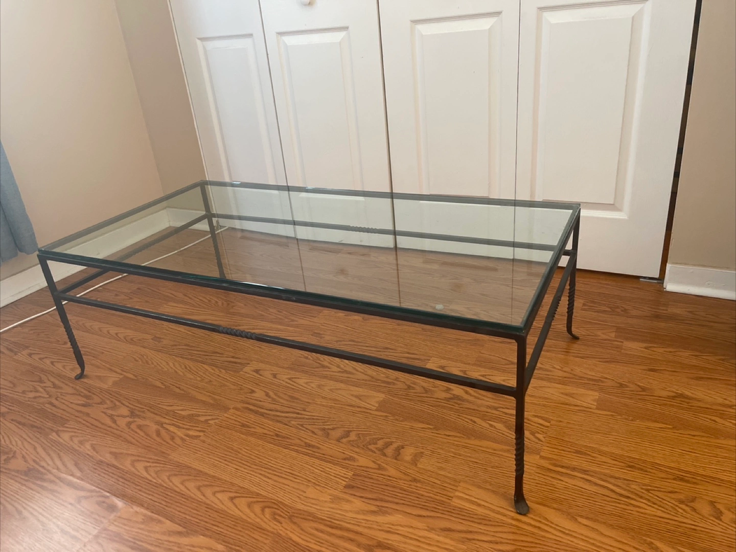 Selling a glass top coffee table with a metal frame. It's in good condition and would look great in any living room! The table has a simple, modern design that fits well with various decor styles