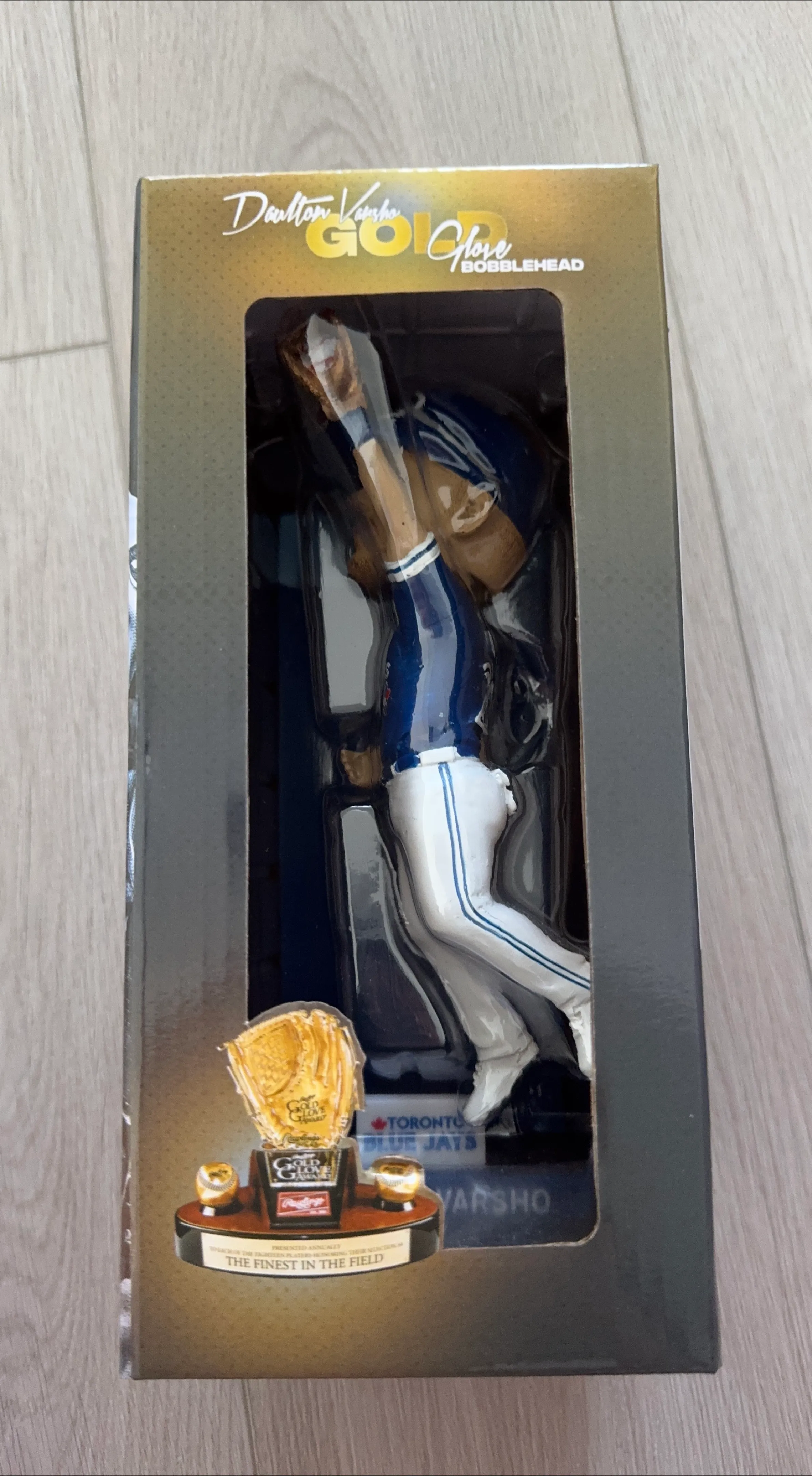 Selling a Daulton Varsho Gold Glove bobblehead figure. It's in the original box and features the Toronto Blue Jays player. "The Finest in the Field" is displayed on the base of the bobblehead