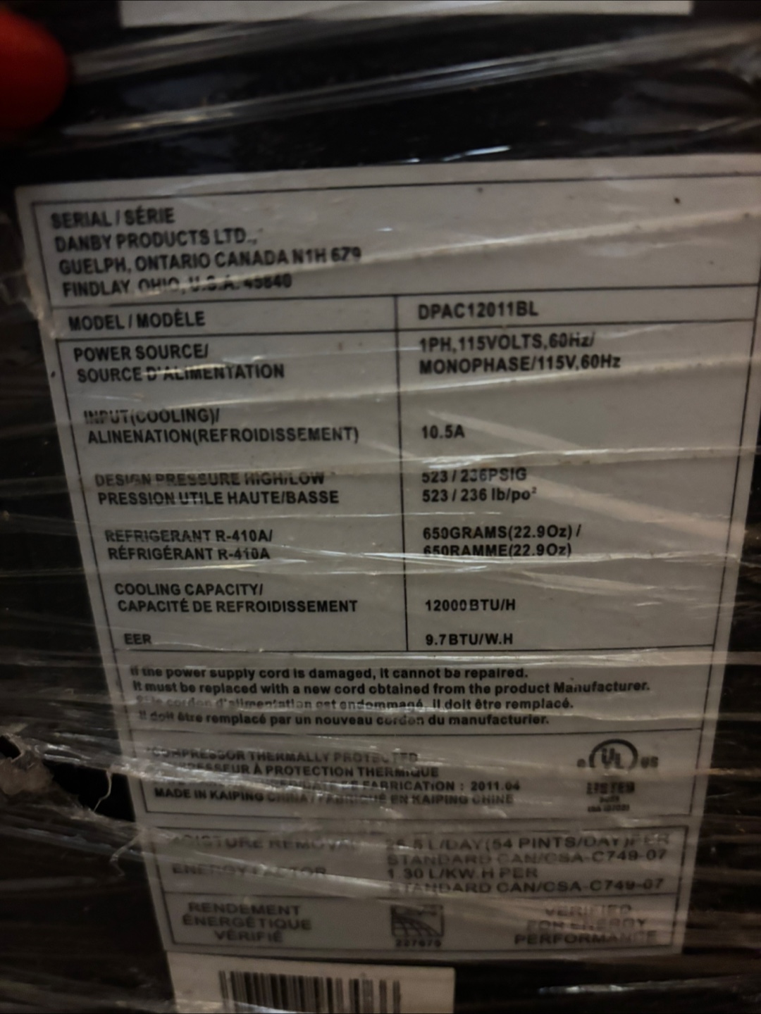 Selling a Danby Premiere portable air conditioner, model DPAC12011BL. It operates at 115 volts and 60Hz. The cooling capacity is 12000 BTU/H. It is in used condition, as shown in the pictures barely used bought two years ago at Home Depot.