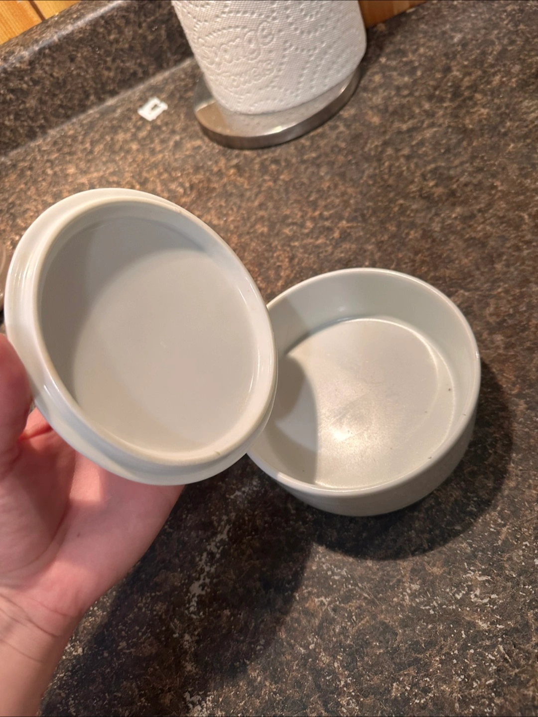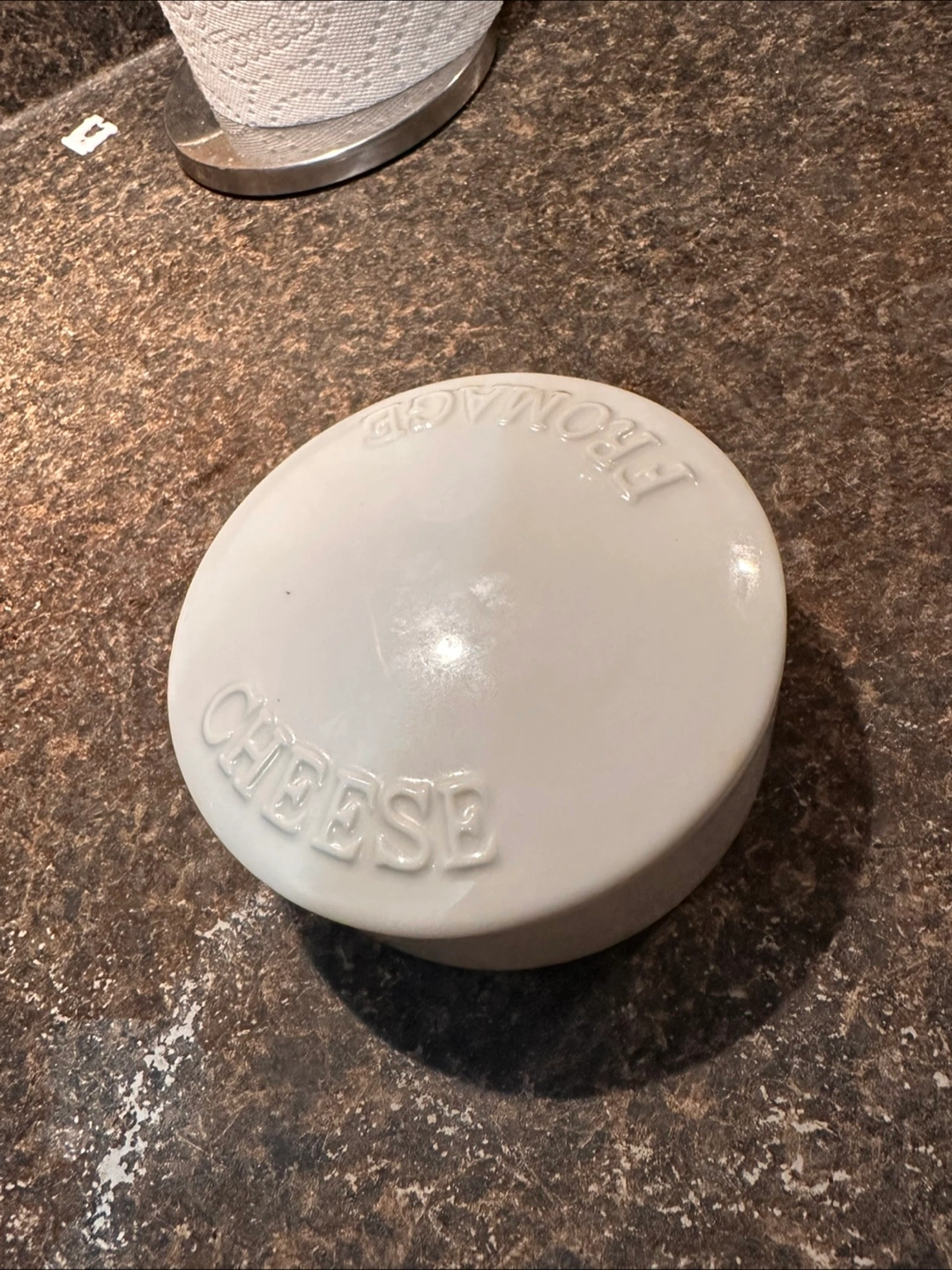 Selling a cute cheese keeper by Infinity! It's in great condition and ready to keep your cheese fresh. The lid says 'CHEESE FROMAGE' around the edge. Food safe and oven safe.