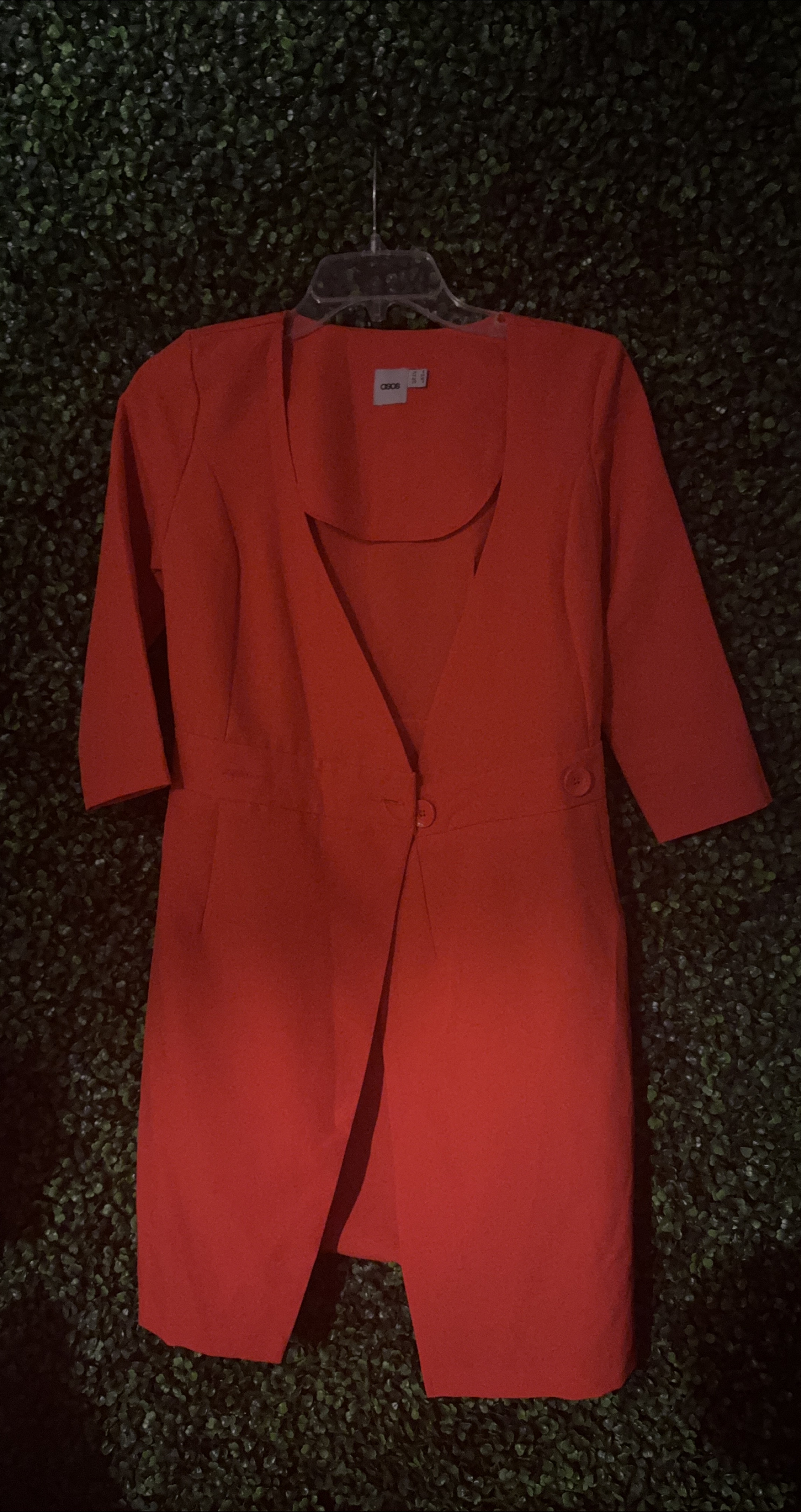 Selling a vibrant red blazer dress from ASOS! It features a unique asymmetrical front with a single button closure. The dress is in great condition and perfect for a night out or a business casual setting