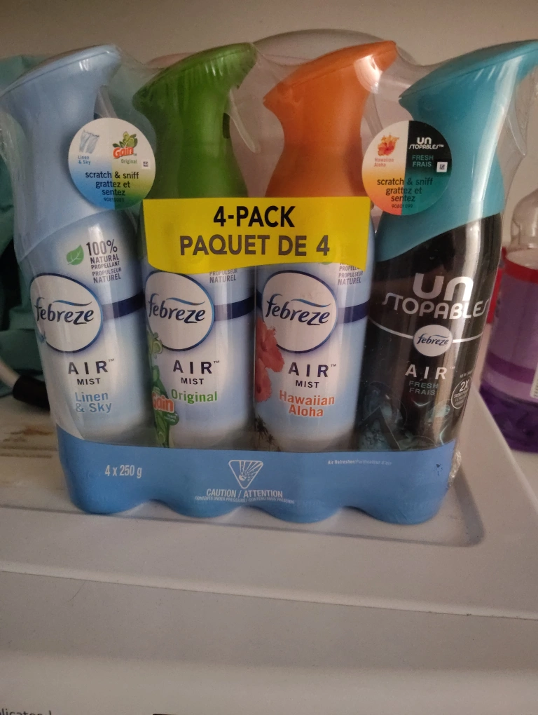 Selling 2 4-pack of Febreze Air Mist! Includes Linen & Sky, Original, Hawaiian Aloha, and Unstopables Fresh scents. Perfect for keeping your home smelling fresh and clean. Each $20, both $40.