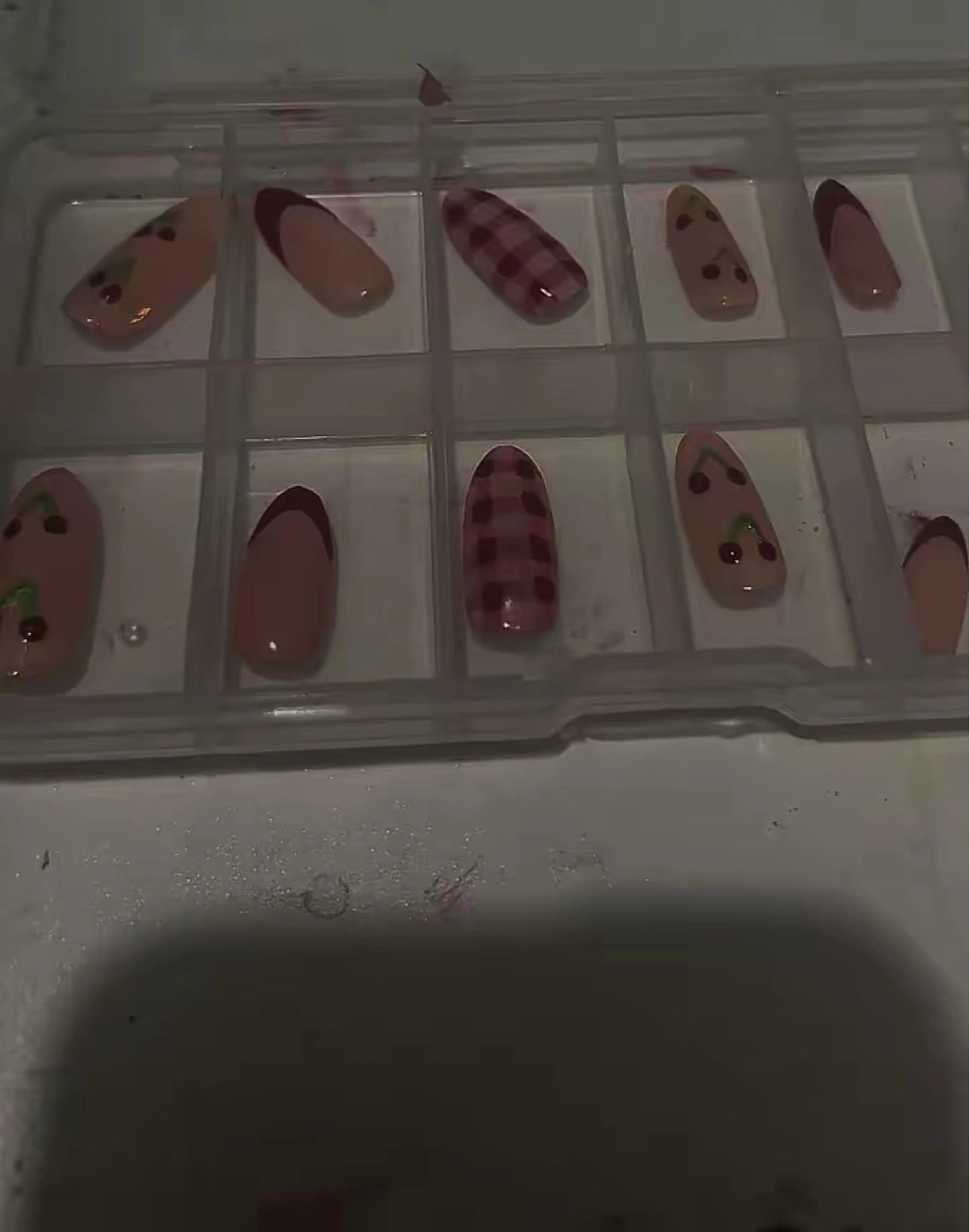 Here's a set of press on nails with cute cherry and plaid designs! They are in great condition and ready to add a touch of fun to your look it comes with a prep bag with glue,nail file,buffer,stickers cuticle pusher,wipes and the nails.I can do custom nails too!