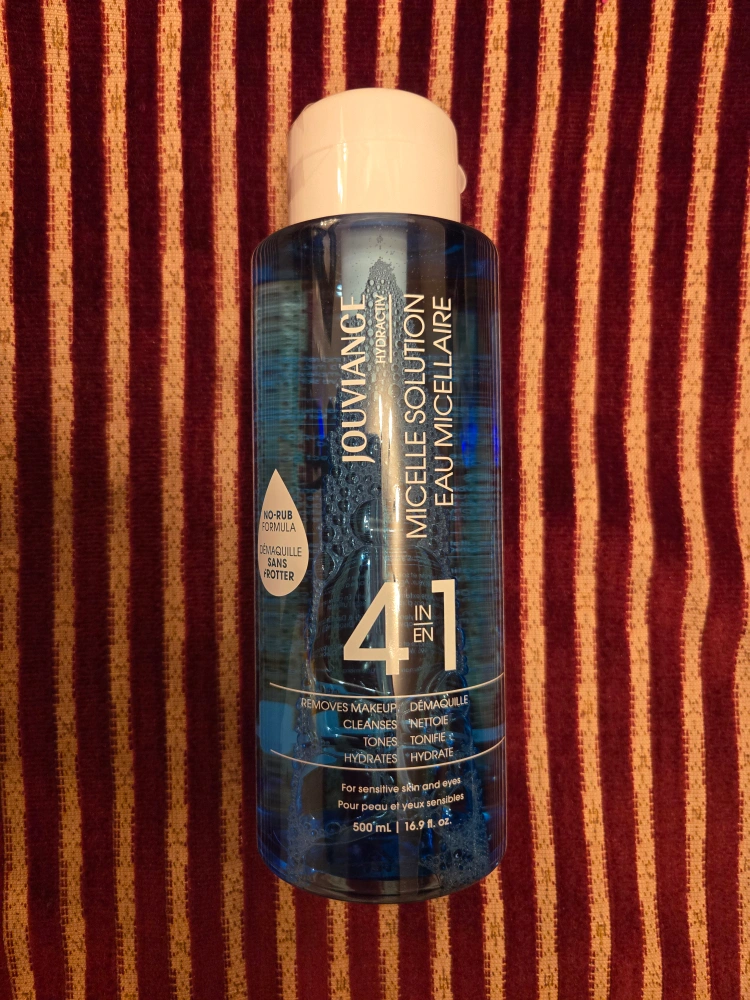 Selling a bottle of Jouviance Micelle Solution Eau Micellaire. It's a 4-in-1 formula that removes makeup, cleanses, tones, and hydrates. Perfect for sensitive skin and eyes! The bottle contains 500 mL or 16.9 fl oz