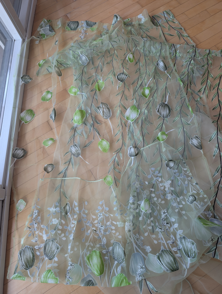 Sheer, green curtain - 2 panels vine, 1 panel flowers