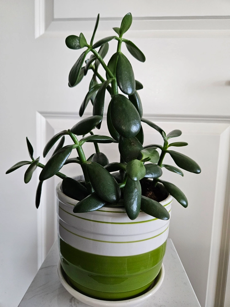 I'm selling a lovely jade plant in a cute striped pot! It's a healthy, thriving plant that would look great in any home or office. The pot is white and green with horizontal stripes, adding a touch of modern style to this classic houseplant