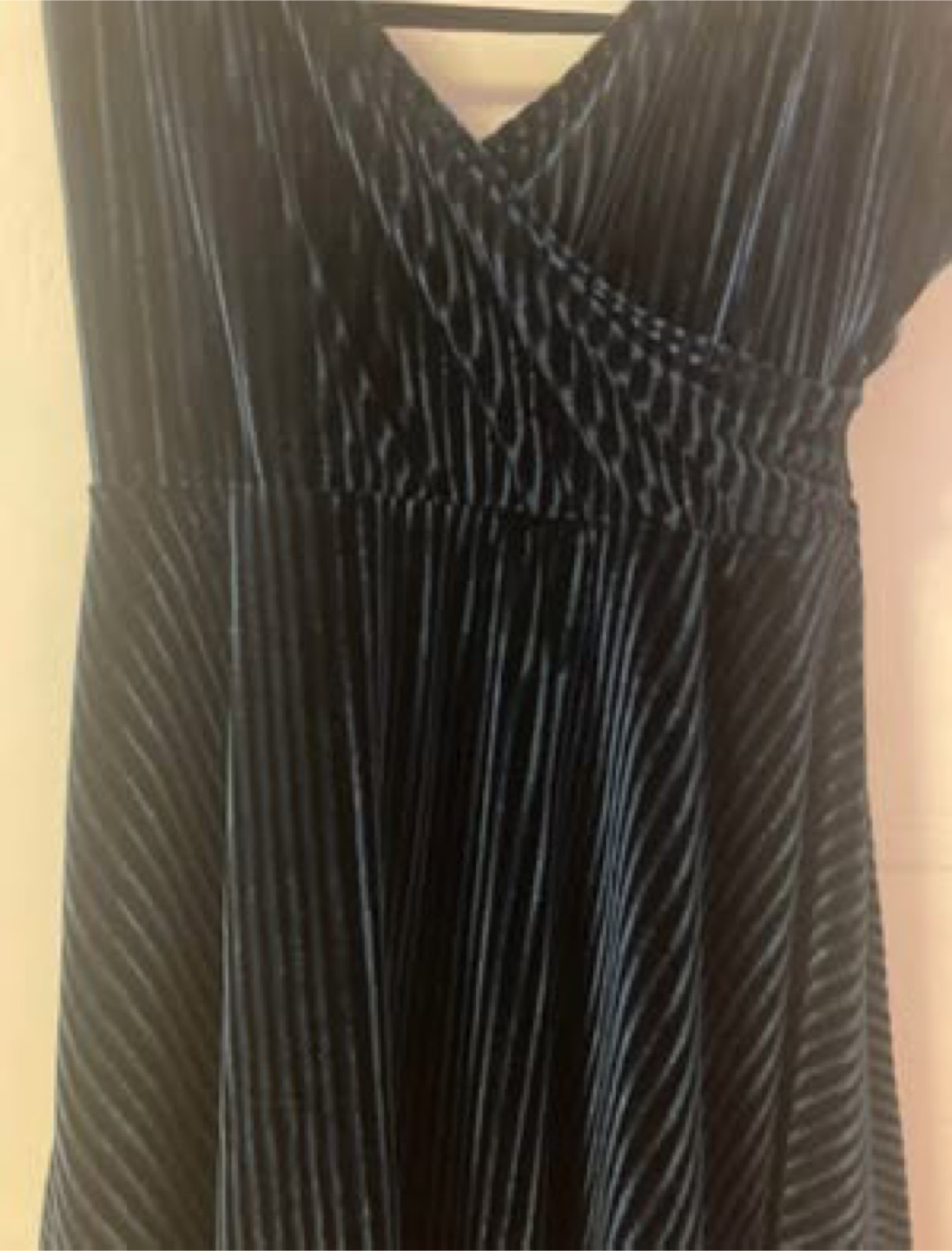 dark blue, sleeveless, velvet dress with a V-neck. The dress has a fitted bodice and a flowing skirt