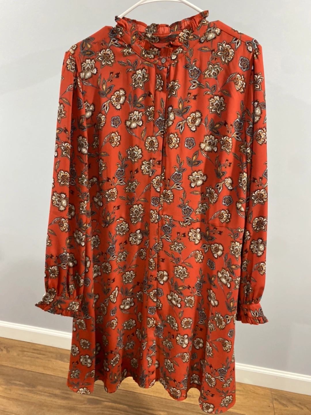 This dress features a beautiful floral print and long sleeves, perfect for transitioning between seasons. It has a ruffled neckline and cuffs, adding a touch of elegance to the overall design. The material is lightweight and comfortable, making it ideal for everyday wear or special occasions.
