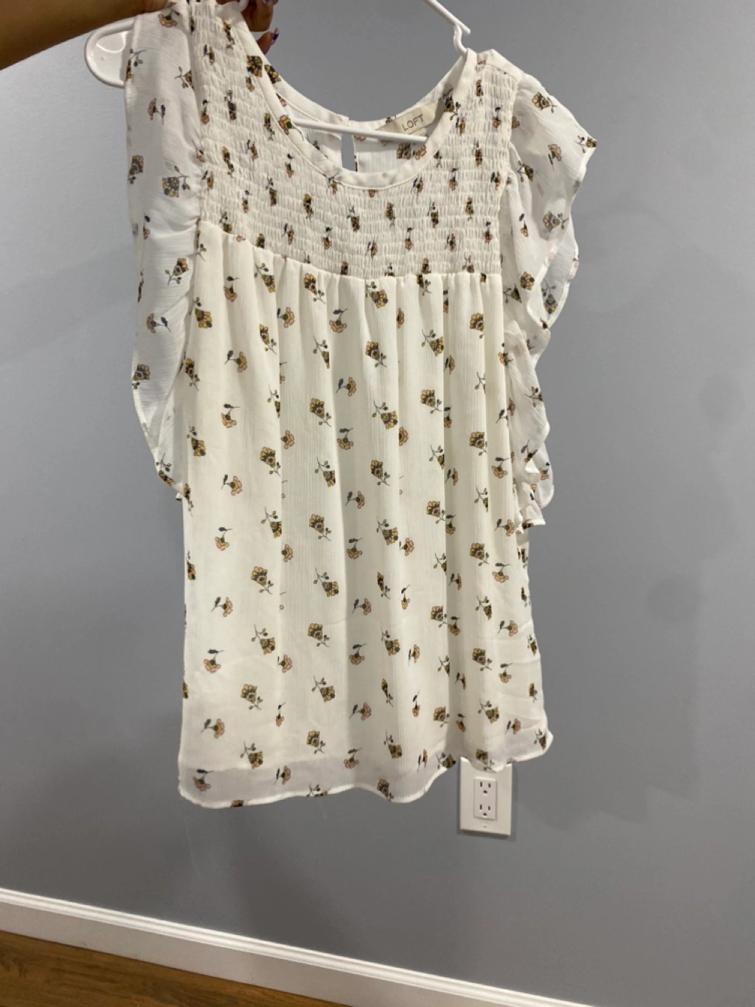 This is a LOFT floral smocked top. It's in great condition and features a cute floral pattern on a white background