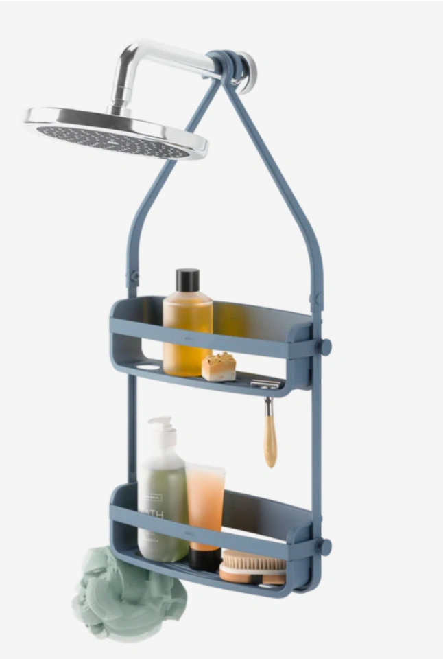 Store all your shower essentials in one place with Umbra’s highly functional Flex Shower Caddy. Flex was designed to take up minimal space in the shower while still accommodating larger bottle sizes. Made of a rigid plastic frame, Flex Shower Caddy features flexible silicone bands that give plenty of storage options. Flex also features two extra wide plastic shelves to accommodate all your shampoo, conditioner and body wash while the four hooks are perfect for loofahs and storing razors. Utilize the four “Bottle Collars” to hold your bottles bottom-up, making it possible to dispense every drop, while holding your bottle in place. No need to worry about moisture or product buildup as Flex features an integrated draining system that prevents unwanted mold and mildew. Flex can be mounted either over the shower head or the on the shower curtain rod. Measures 12.13 x 3.5 x 25.5" (31 x 9 x 65 cm). ♻️ Made from 90% recycled plastic