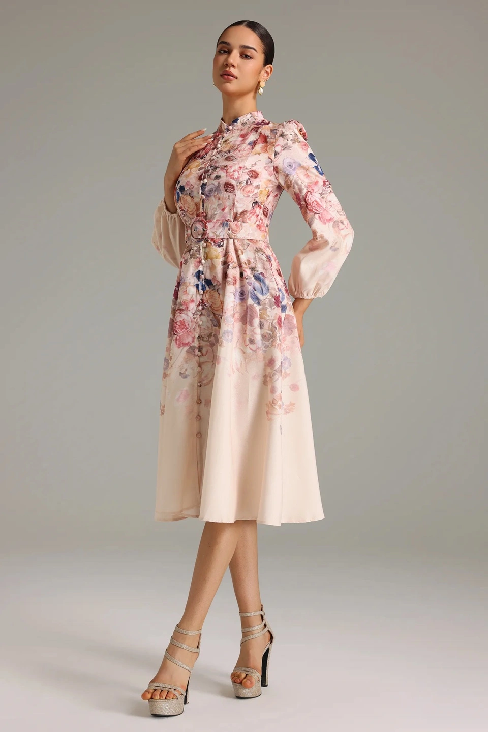 This is a beautiful midi dress with a floral print! It features long sleeves, a belted waist, and a button-up front. Perfect for a special occasion or a day out