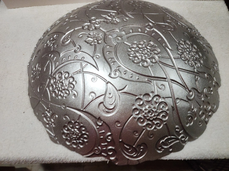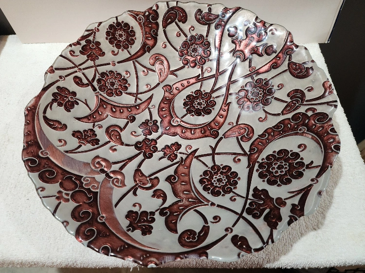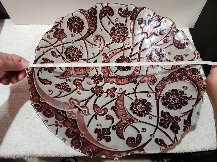 Beautiful decorative plate with a floral pattern in silver and brown. It measures approximately 14 inches in diameter. Perfect for adding a touch of elegance to your home decor.
