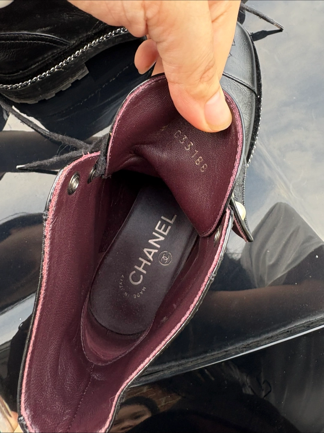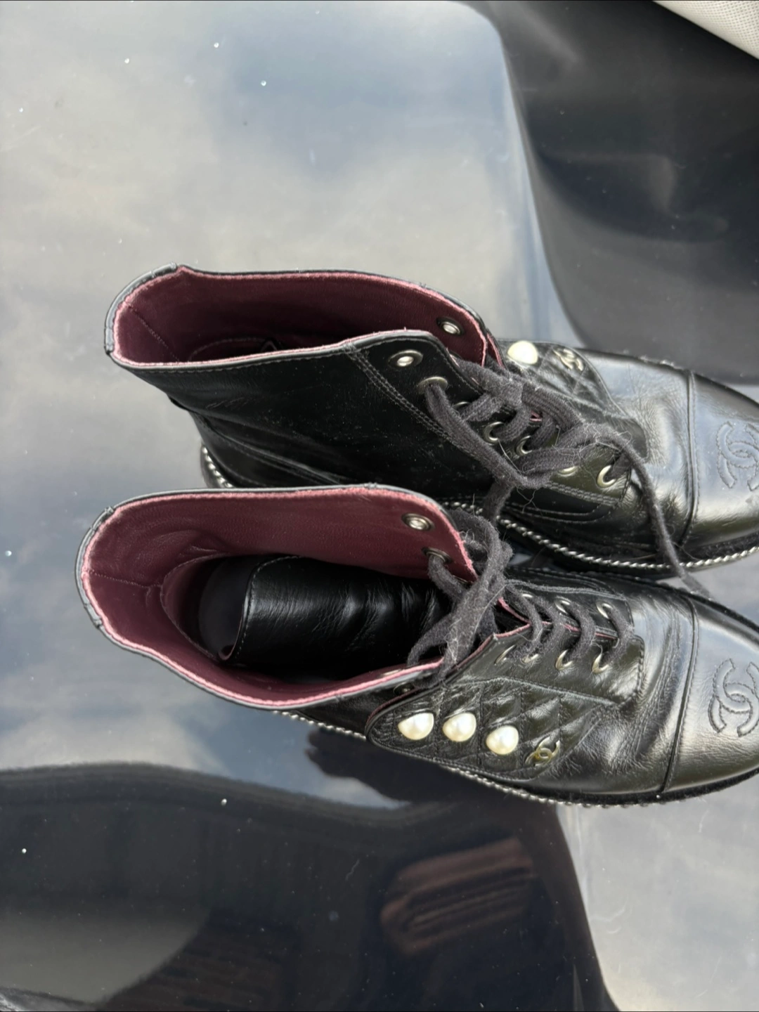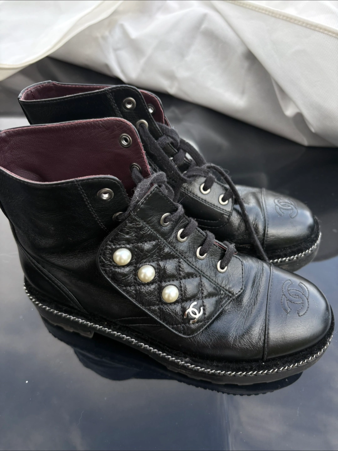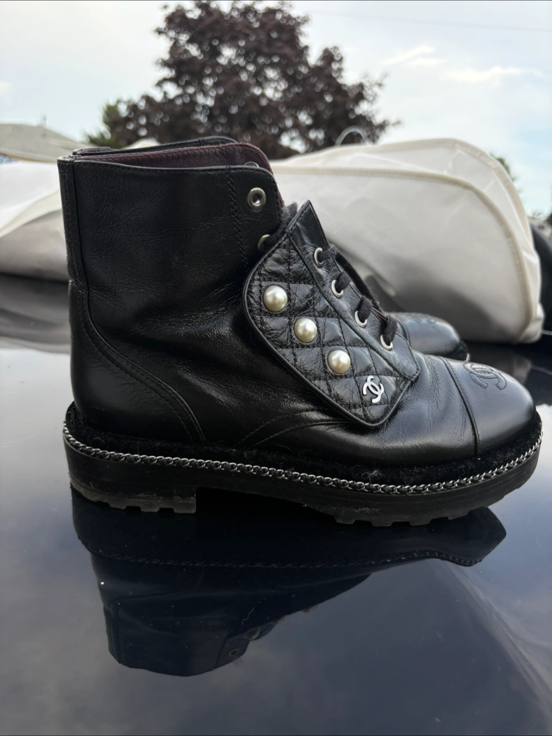 Selling a pair of stylish Chanel ankle boots in black leather. These boots feature a unique design with pearl embellishments and the iconic Chanel logo. They are in great condition and perfect for adding a touch of luxury to your wardrobe!