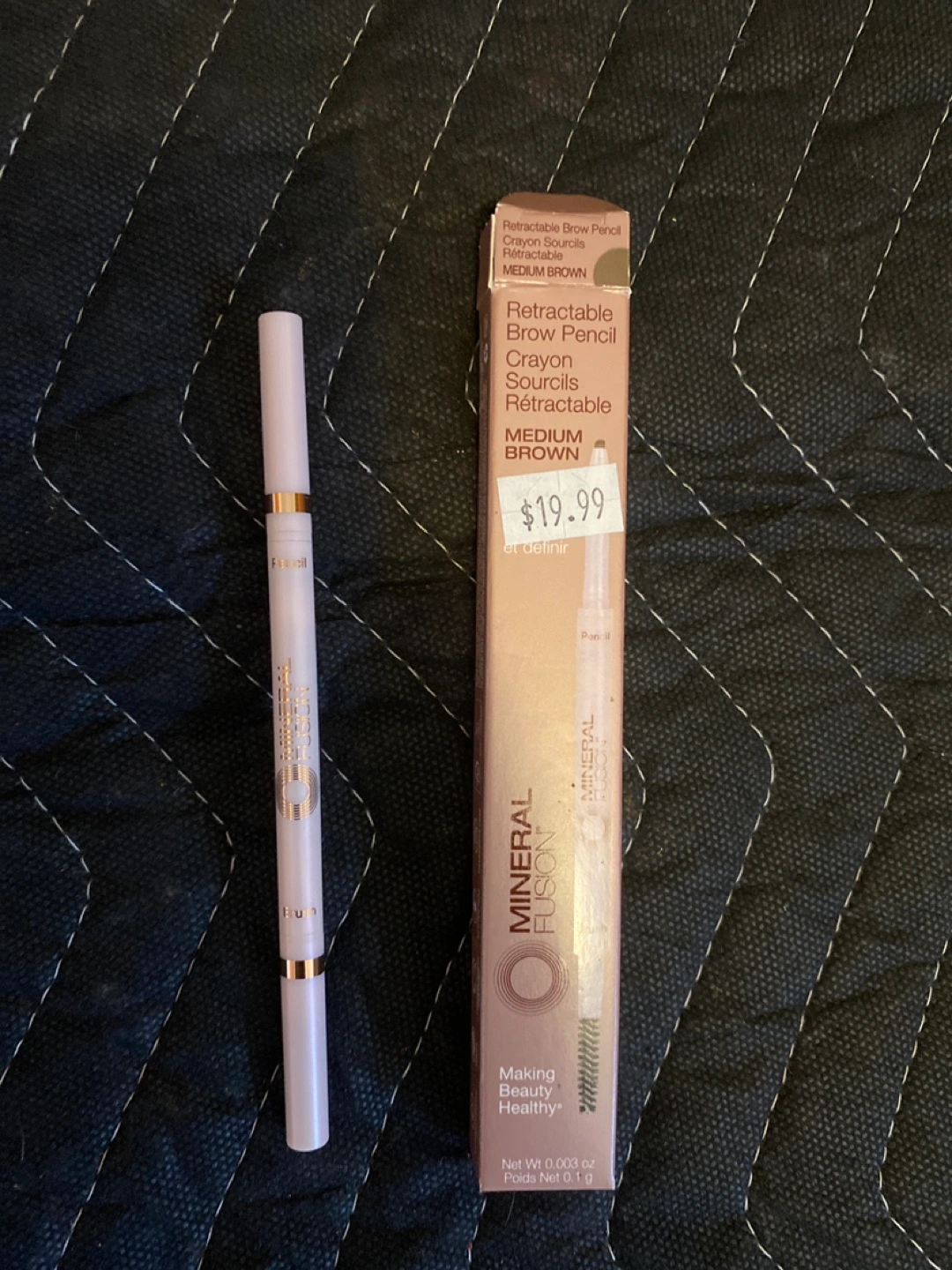 Here's a Mineral Fusion Retractable Brow Pencil in Medium Brown. It's brand new! The original price was $19.99. It's a retractable brow pencil, making beauty healthy. The net weight is 0.003 oz/0.1 g