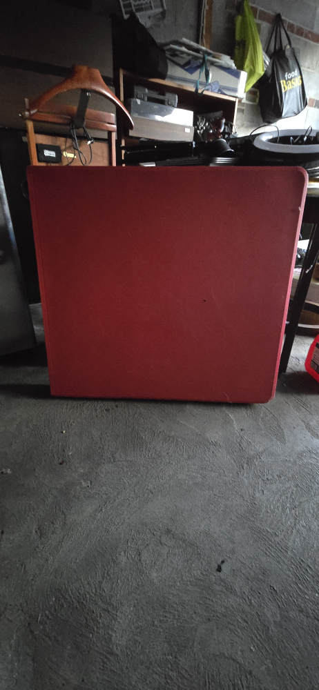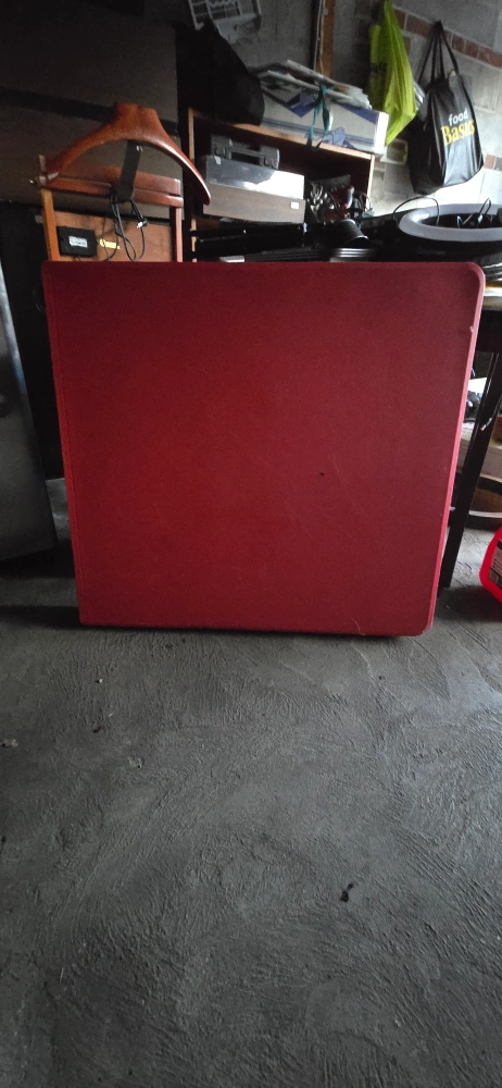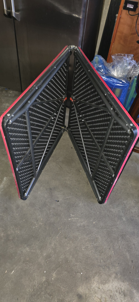 Selling a folding table with a red top. It's in good condition and perfect for extra space when you need it! It folds up easily for storage