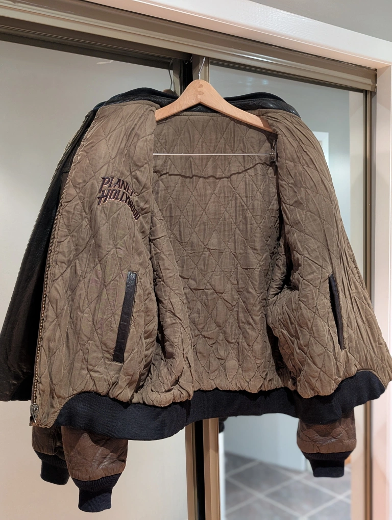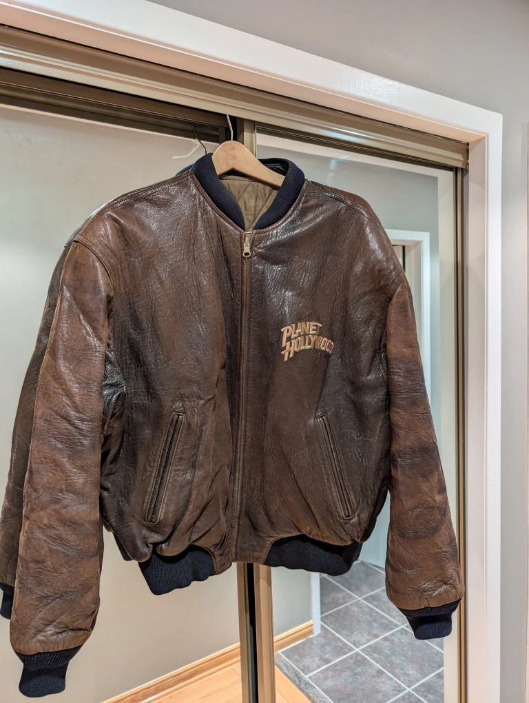 Planet Hollywood leather bomber jacket. Size L. It's a cool piece of memorabilia! The jacket is brown leather with the Planet Hollywood logo on the front and back. The lining is quilted. It's in good condition, with some signs of wear that give it a vintage look. Made in Korea.