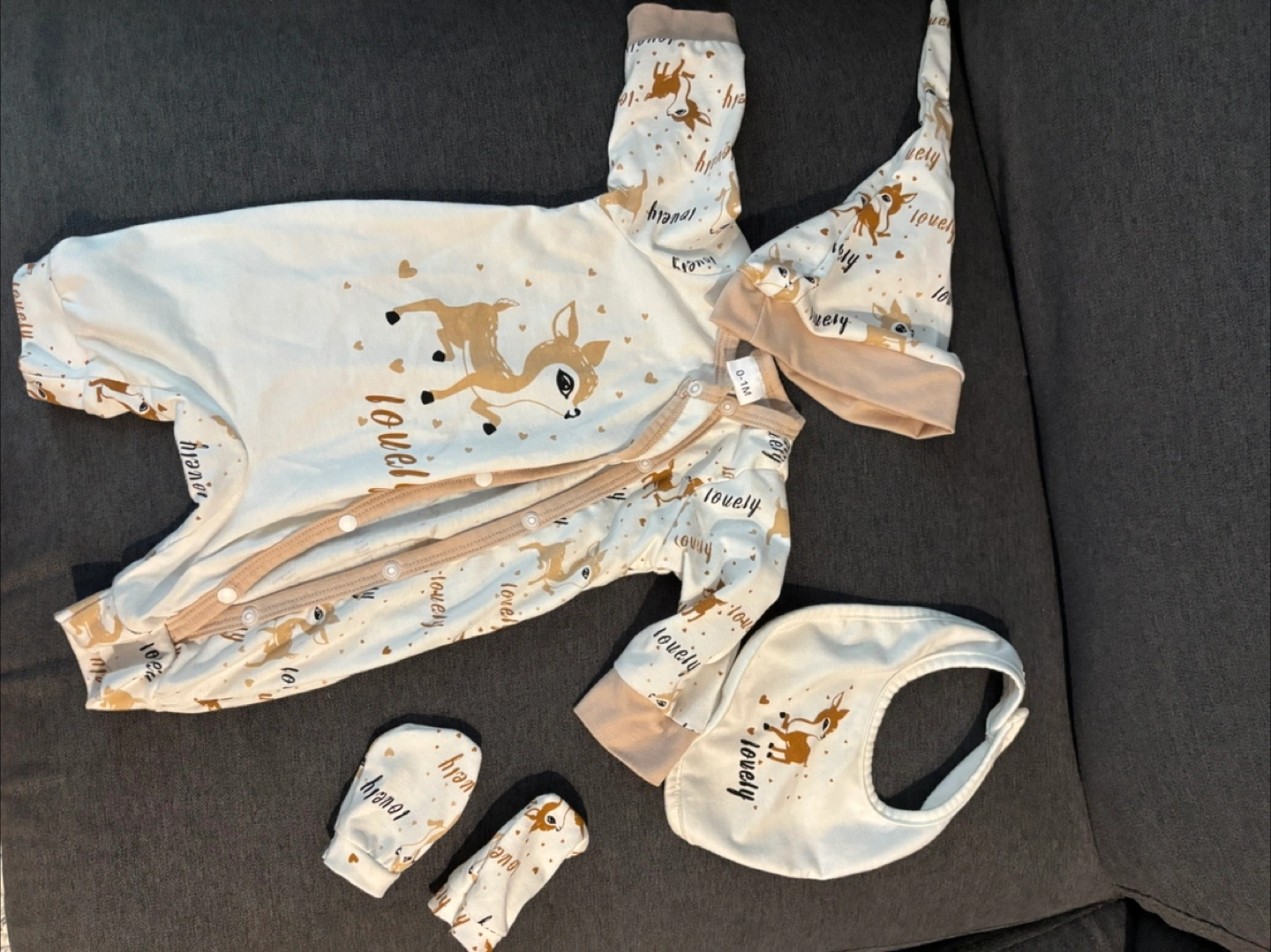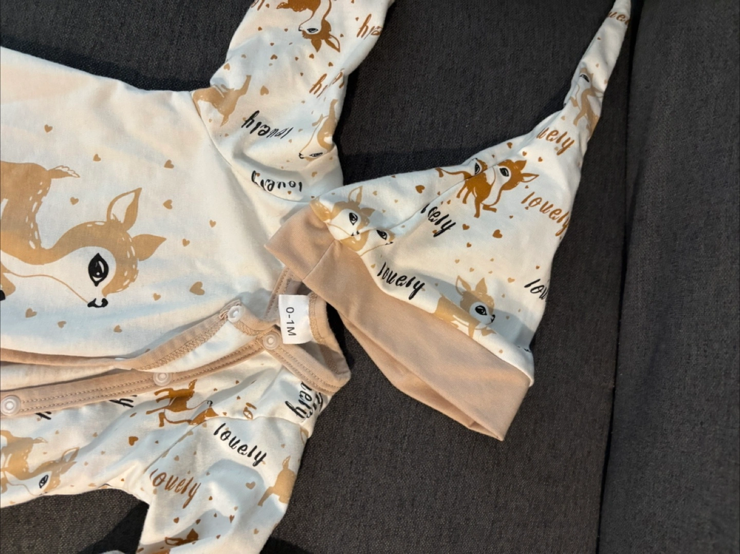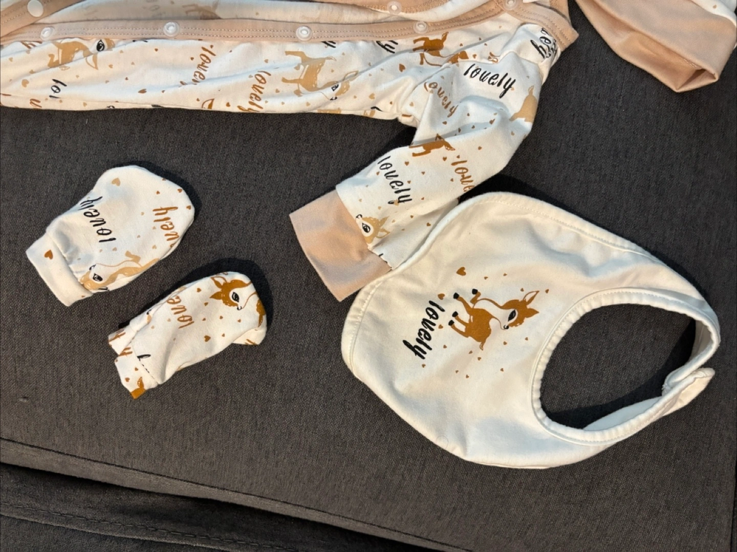 A super cute baby outfit set, size 0-1 month! Includes a onesie, hat, bib, and mittens, all with an adorable deer print. Perfect for your little one!