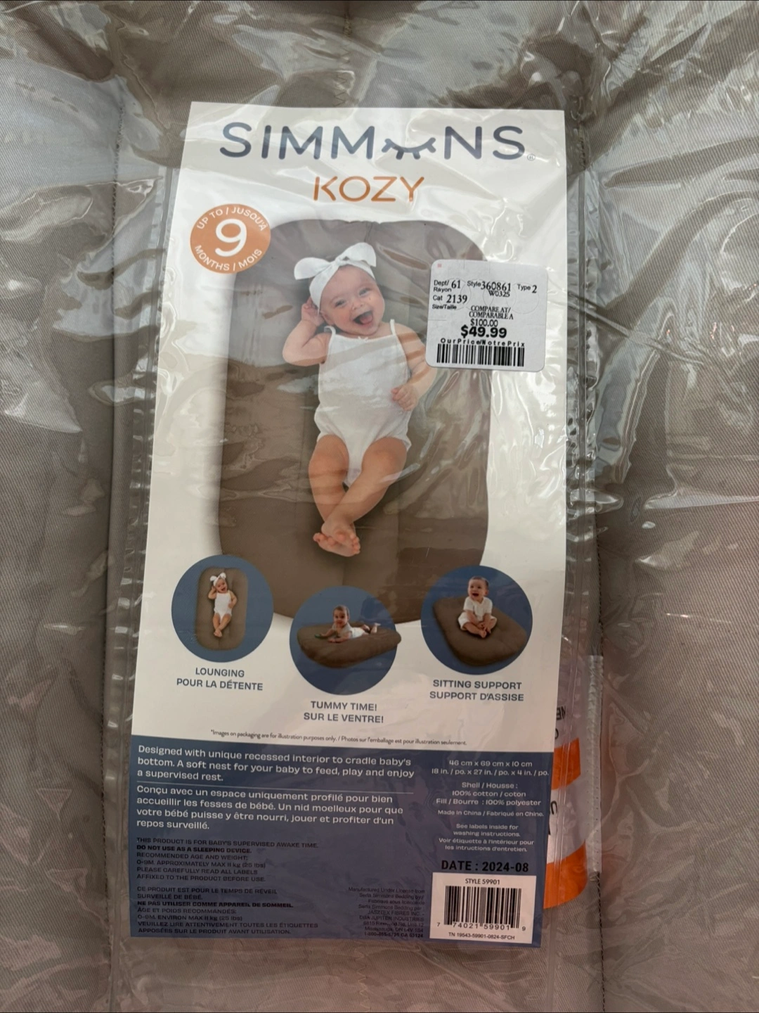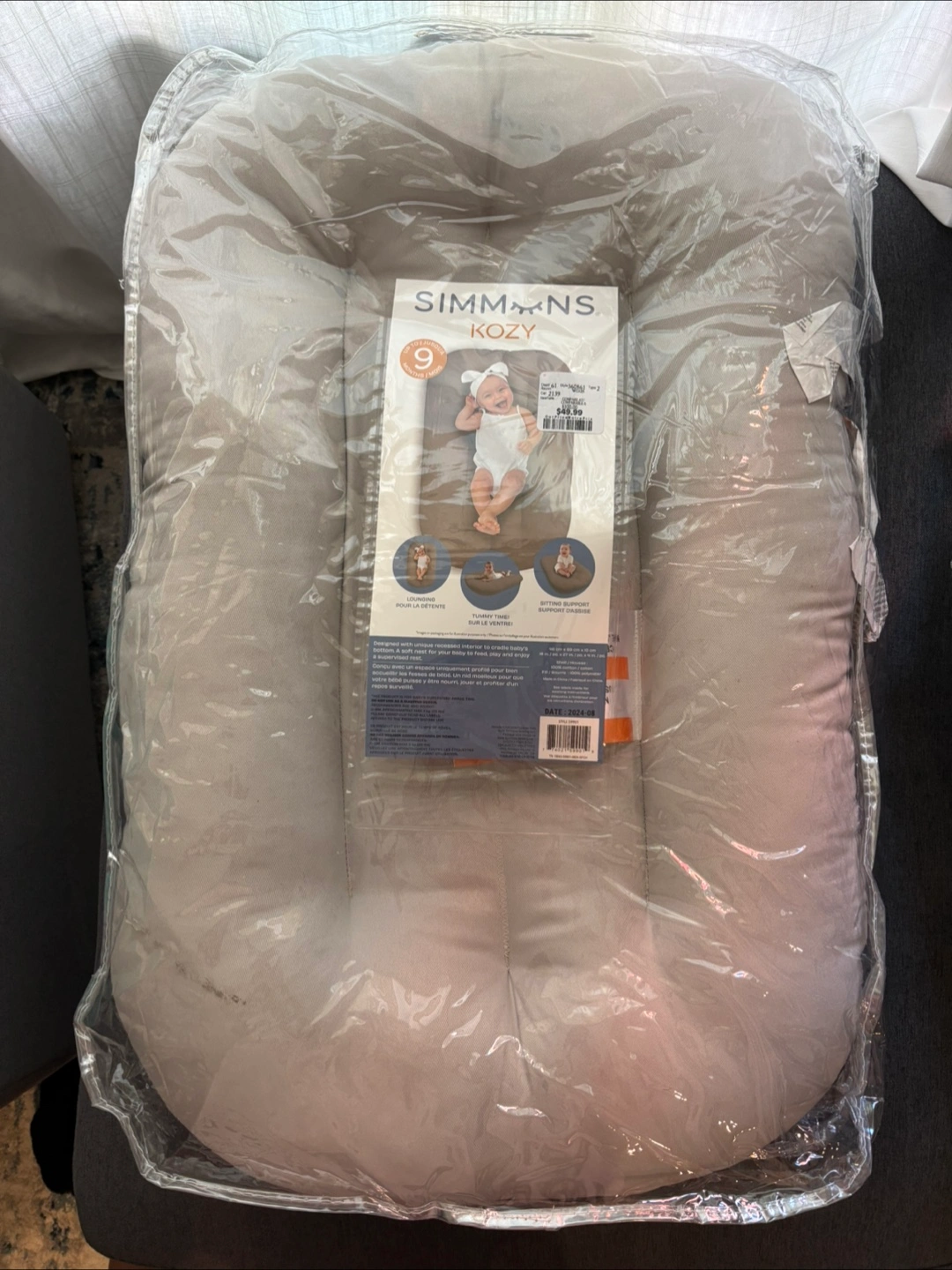 Selling a brand new Simmons Kozy baby lounger, still in its original packaging! This soft nest is perfect for your baby to feed, play, and enjoy tummy time. It's designed with a unique recessed interior to cradle your baby.
