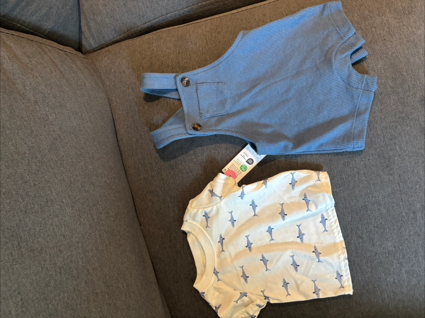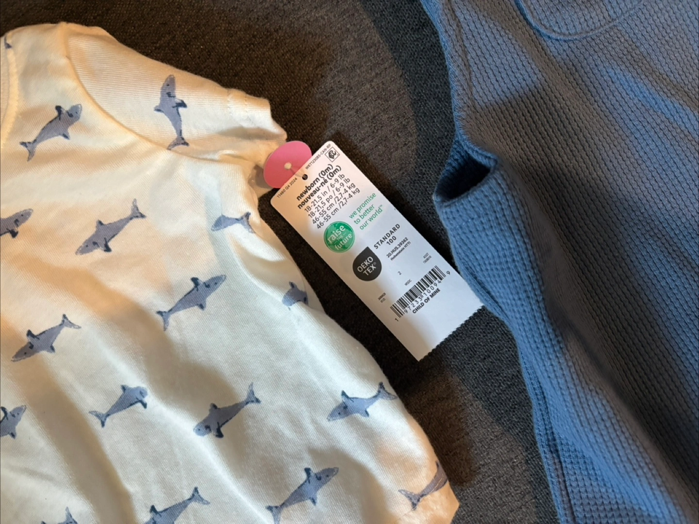 I'm selling a cute Child of Mine 2-piece set for newborns! It includes a blue romper and a white t-shirt with a shark print. The size is newborn (0m).