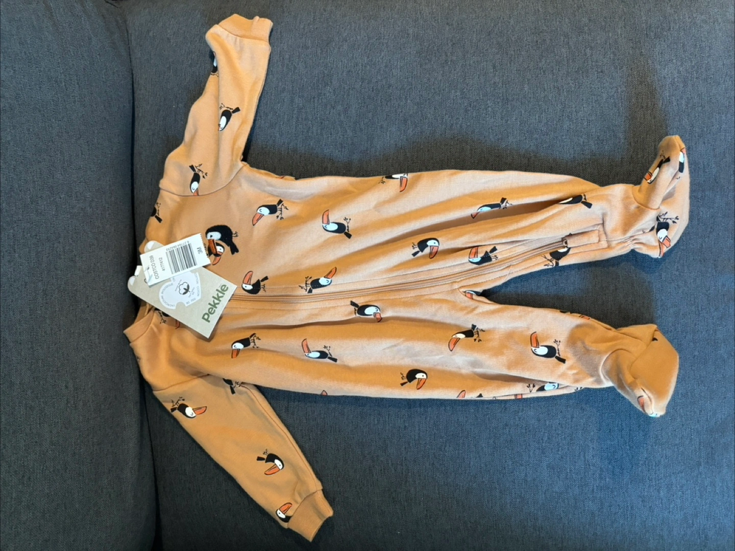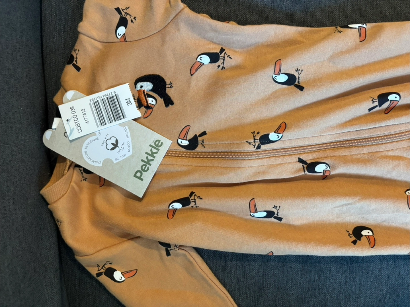 Selling a brand new Pekkle footed romper in size 3M. It's a super cute design with toucans all over! Made of soft cotton, perfect for your little one.